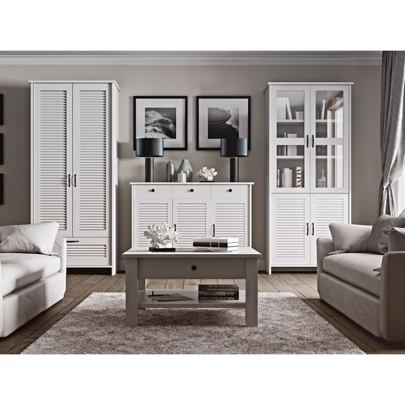Nábytek do místnosti Agadir je kombinací vysoké komody se sklem a konferenčního stolku. Soupravu doplňuje dvoudveřová skříň se zásuvkou, která uvnitř skrývá velký úložný prostor.