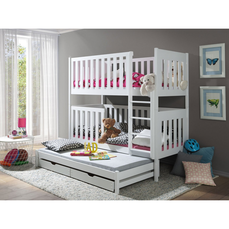 Patrová postel Deosen nové generace poskytuje pohodlné spaní pro tři děti. Dvě úrovně byly rozšířeny o výsuvnou spací plochu pod nimi, aby se mohli pohodlně vyspat sourozenci nebo kamarádi ze školy, kteří Vaše děti navštíví.