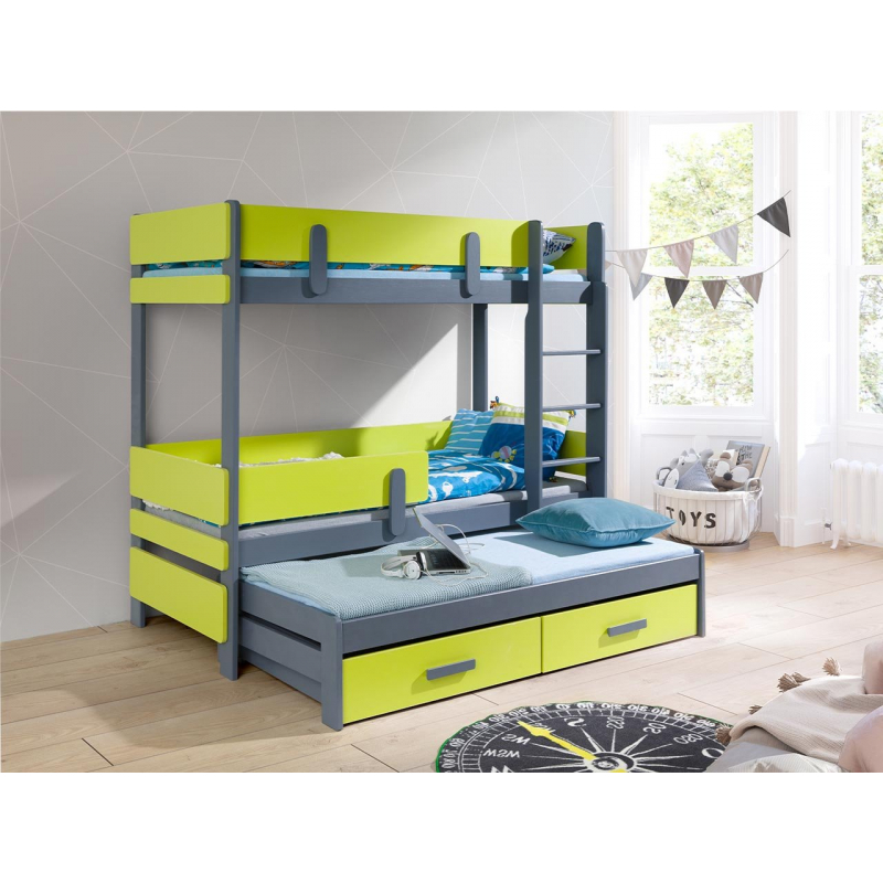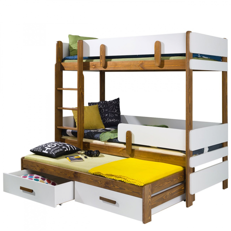 Pevná konstrukce z borovicového dřeva a laminované desky poskytuje pocit stability a pohodlí. Součástí sady jsou rošty a žebřík, které lze přizpůsobit individuálním potřebám. Nábytek je navíc vybaven úložným prostorem, který poskytuje další úložný prostor. Bezpečnost těch nejmenších zajišťuje pevně vyrobené zábradlí. Tento model je patrová postel pro 3 osoby, která zajistí klidný spánek vašim dětem i hostům.