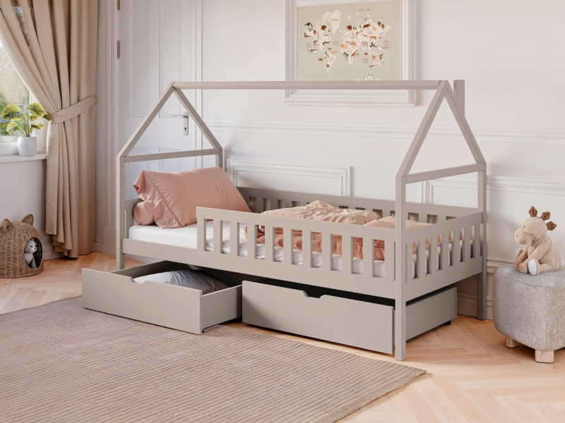 Dětská postel Jundia se šuplíky je dokonalým řešením do pokojíčku vašeho batolete! Jedinečný design ve tvaru domu z něj činí nejen místo ke spaní, ale i prostor pro hraní a rozvíjení fantazie. Pevné zábradlí zajišťuje bezpečnost proti pádu během spánku.