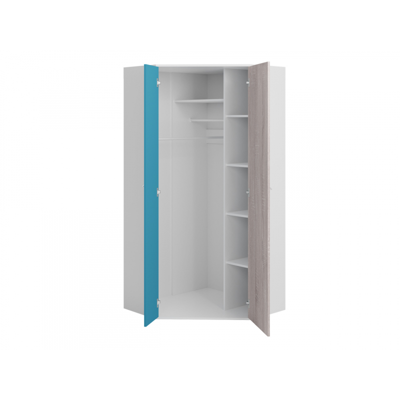 Sestava je dále poskládána z velké rohové šatní skříně a dvojicí polic. Do této trojice se vejde všechno oblečení, obuv, dokonce i elektronika a dětské hračky. Na policích je také dostatek místa pro učebnice, pomocné knihy a doplňky, které prostor zdobí. Rámečky s důležitými fotografiemi můžete umístit na dlouhou závěsnou polici.