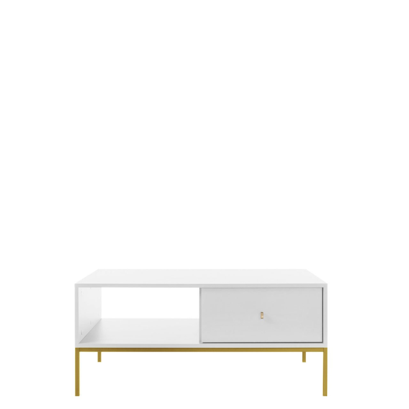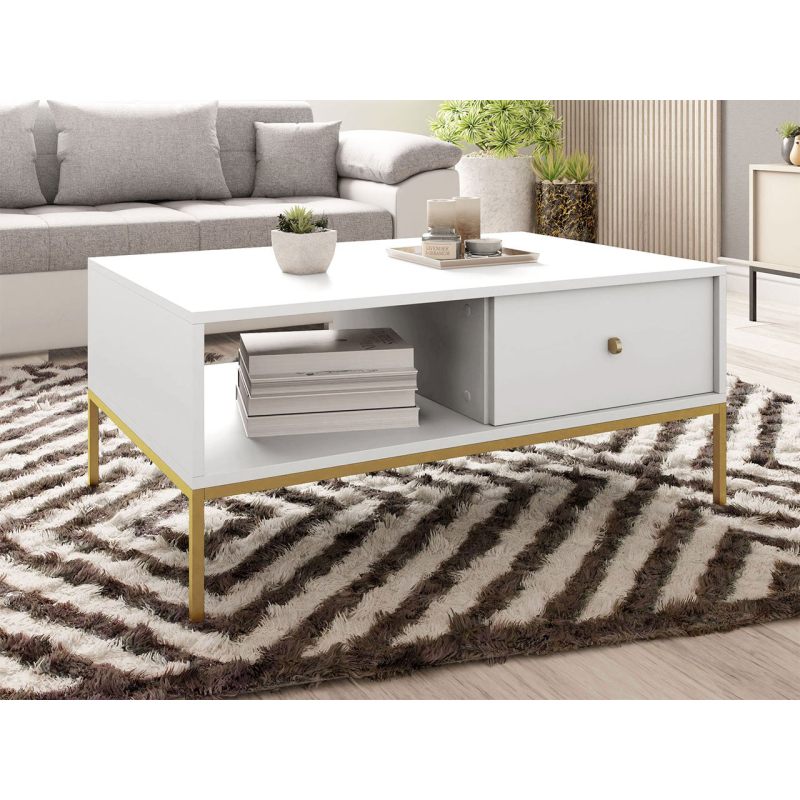 Moderní konferenční stolek se zásuvkou Tonkor Gold TL104 se postará o stylový vzhled každého obývacího pokoje. Nejmodernější barevné provedení je doplněno detaily ve zlaté barvě. Skromná elegance v kombinaci se zvýšenou funkčností je skvělým základem pro domácí relaxační zónu. Stolek vám pomůže při sledování filmů, setkání s přáteli nebo při odpočinku s knihou v ruce a poskytuje prostor pro nápoje a občerstvení.