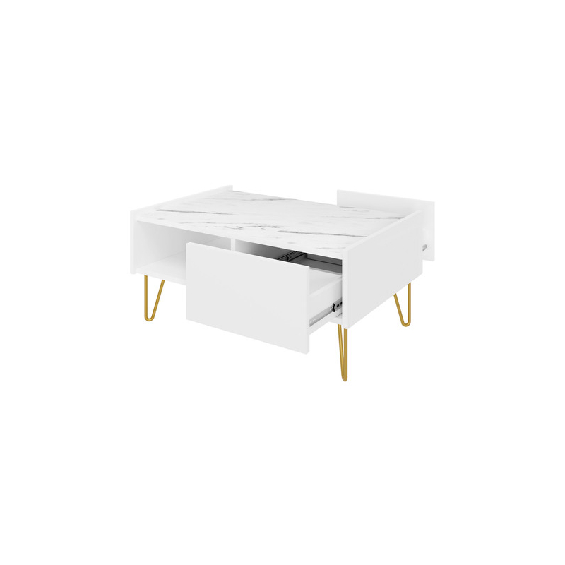 Vizuální zóna není jedinou vrstvou, která potěší. Konferenční stolek má praktickou zásuvku, kam si můžete odložit knihy, časopisy nebo kabely. Zajímavou možností je také otevřená police, kam si můžete odložit věci, které se vyplatí mít rychle po ruce. Model má bezúchytkový systém otevírání díky hraně, která přesahuje přes vrchní desku.. Zlaté nohy nejsou jen dekorativním prvkem, ale také jednoduchým způsobem, jak udržet na podlaze pořádek.