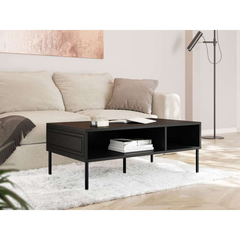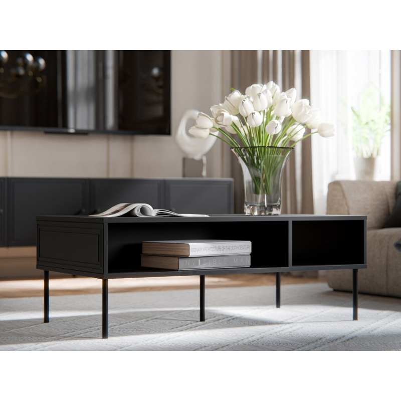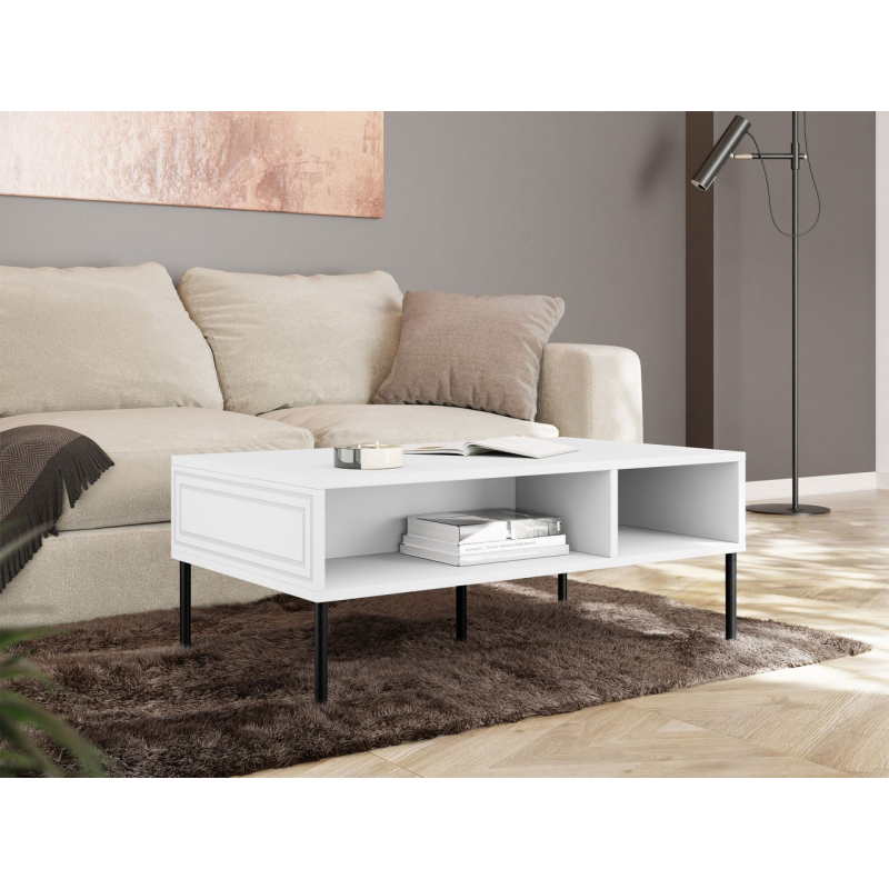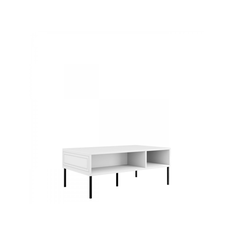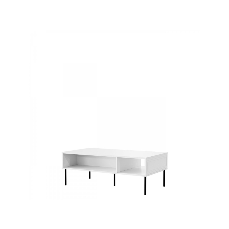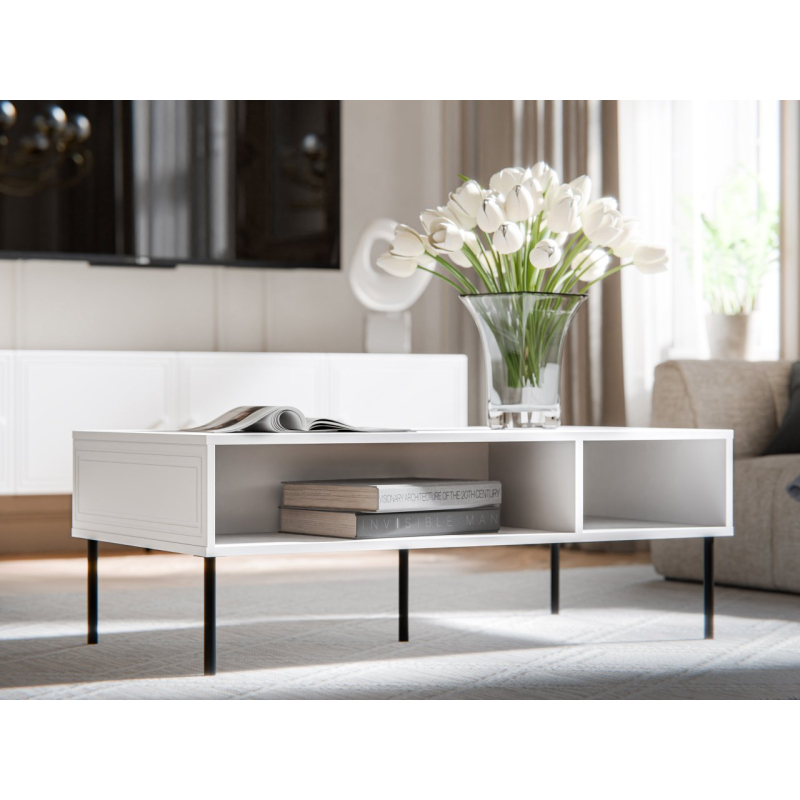 Celá konstrukce je založena na vysokých nohách, což je ideální řešení pro udržení pořádku na podlaze. Boky jsou zdobeny geometrickými vzory a celé je to vedeno v minimalistickém stylu. Další výhodou prezentovaného konferenčního stolku jsou police umístěné pod deskou, kam můžete umístit knihy, dálkové ovladače a další příslušenství.