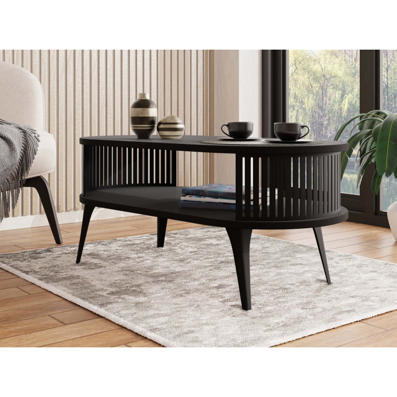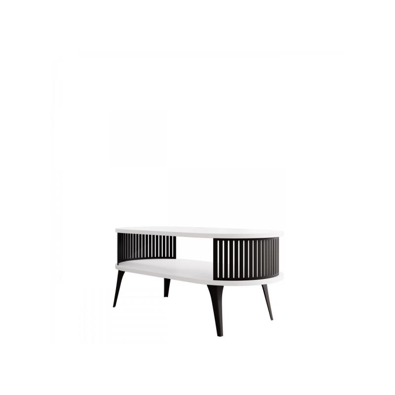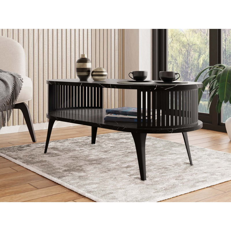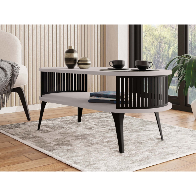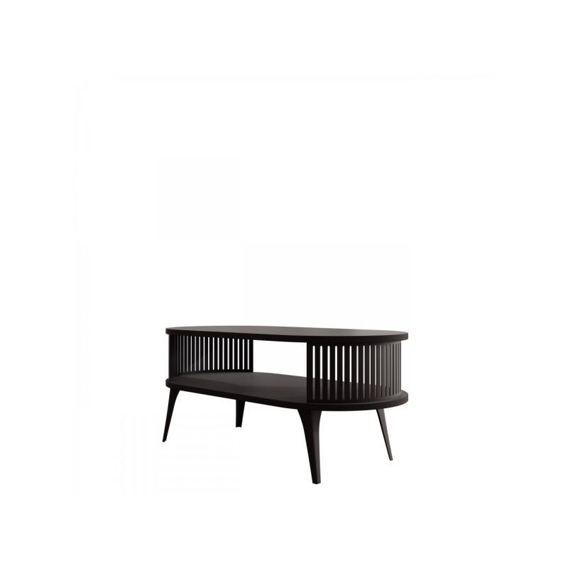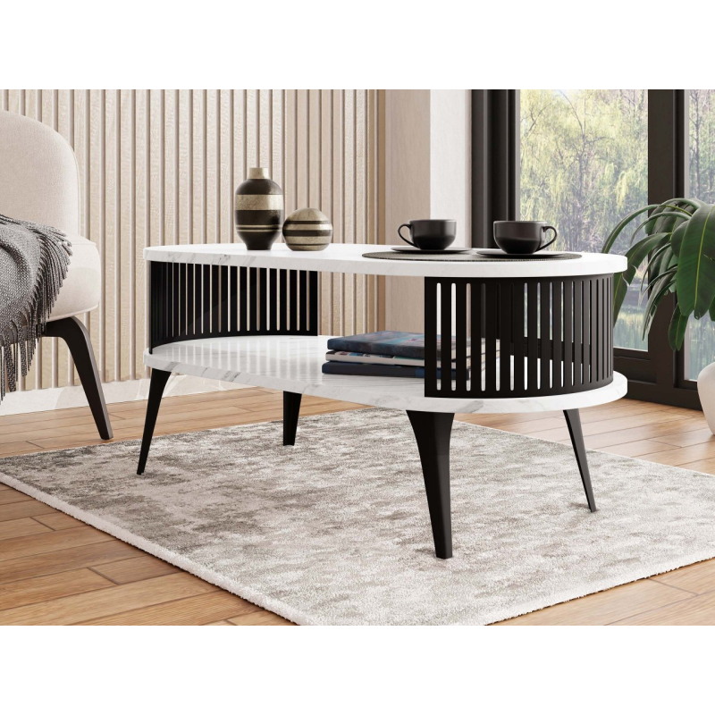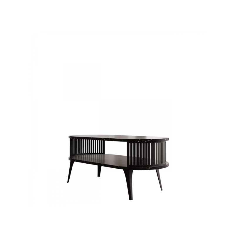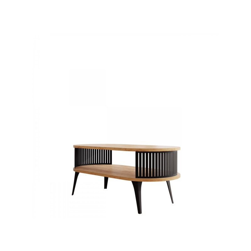 Konferenční stolek Mozimo se postará o elegantní a funkční design ve vašem obývacím pokoji. Vyznačuje se zaobleným tvarem a dvouúrovňovou konstrukcí, která poskytuje prostor pro uložení knih, časopisů nebo dekorací. Výrazným prvkem je prolamovaná, černá struktura, která obklopuje prostor mezi pracovními deskami.