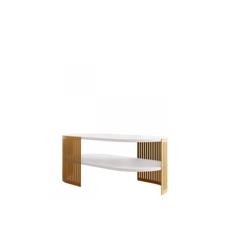 Dodejte svému interiéru šmrnc. Oválný konferenční stolek Zinzit Golden II je mimořádně praktický model, ale ne bez dekorativních hodnot. Jeho konstrukce se skládá ze dvou stolových desek spojených zlatým kovovým rámem. Model dokonale zapadne do interiérů zařízených v glamour stylu.