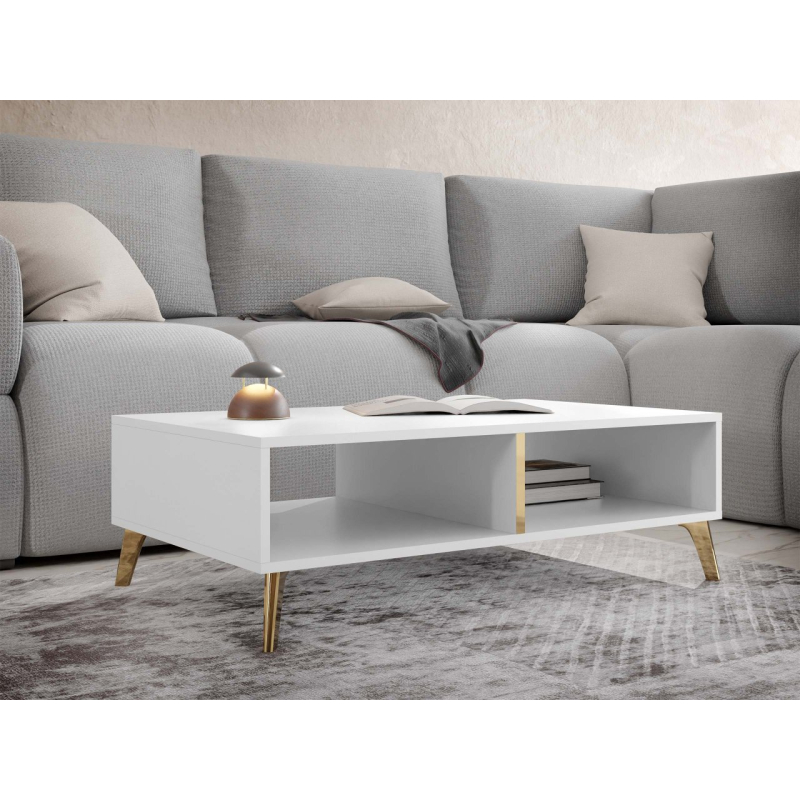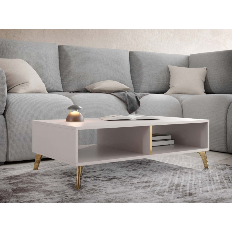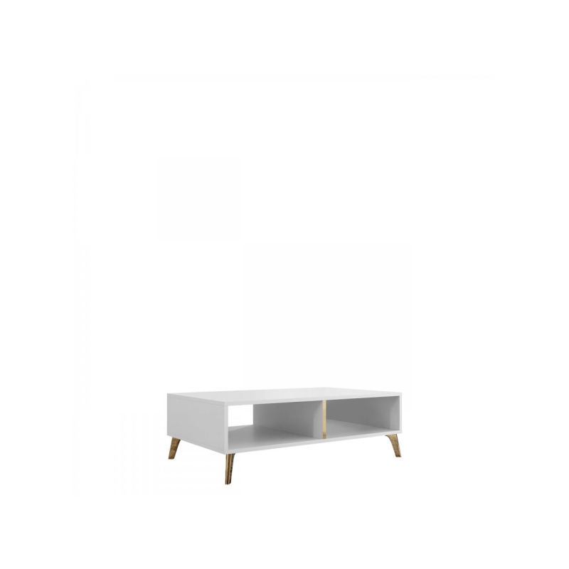 Kouzlo konferenčního stolku Rostiw dodá obývací části vašeho domova efektní vzhled. Geometrický tvar v módní barvě se hodí ke každému čalounění nábytku. Dekorativní výhodou jsou zde vsadky v lesklém odstínu zlata.