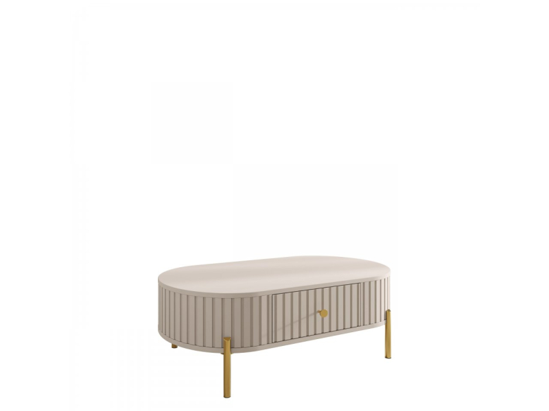 Doplňte si oddechový koutek konferenčním stolkem Kareri 1S. Tento model vás bude s radostí doprovázet při relaxaci na pohovce nebo rohové pohovce. Jeho moderní design je podmanivý. Stojí na zlatých nohách, které mu dodávají lehký a jedinečný charakter. Zaoblený tvar v kombinaci s drážkovanou přední částí vytváří velkolepý vizuální efekt.