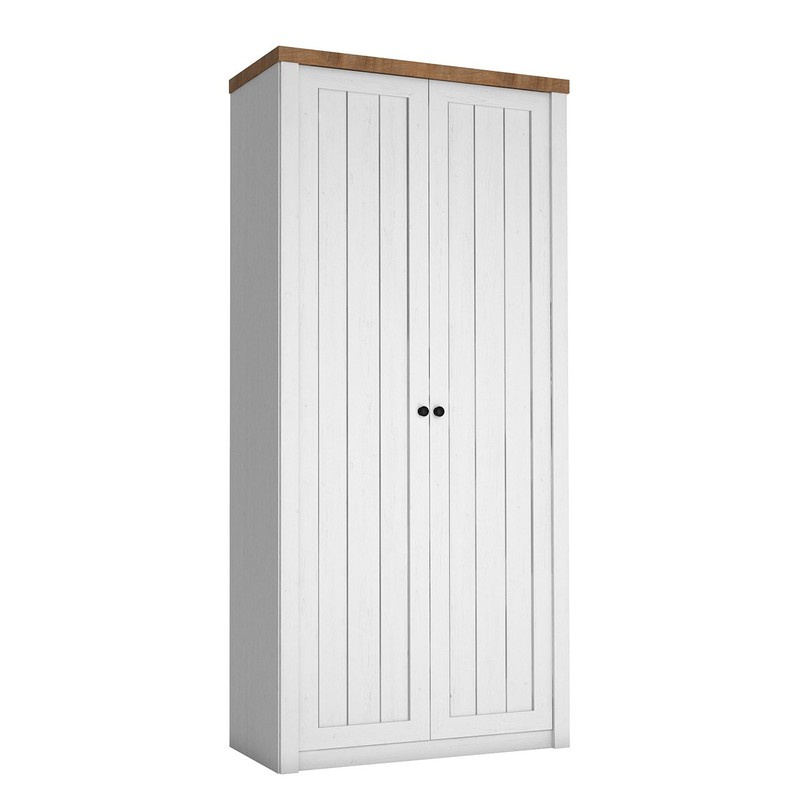 Dvoudveřová šatní skříň 2D Patty PT13 je model, který bude skvělým začátkem k vytvoření provensálského nebo rustikálního stylu. Tento styl nábytku ovlivňují použité barvy, které vycházejí z čisté bílé a teplých přírodních barevných odstínů dřeva. Přední část skříně je tvořena viditelným rozdělením na svislé desky, které ji tvořily, a malými kovovými úchyty.