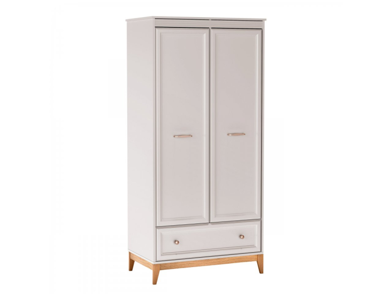 Dvoudveřová šatní skříň nabízí dostatek úložného prostoru. Najdete v ní pět prostorných přihrádek a tyč na košile, šaty a bundy. Součástí je také zásuvka, ideální pro uložení pyžam, ponožek a spodního prádla.