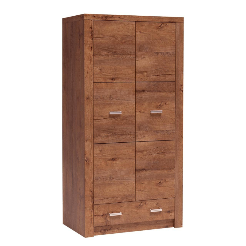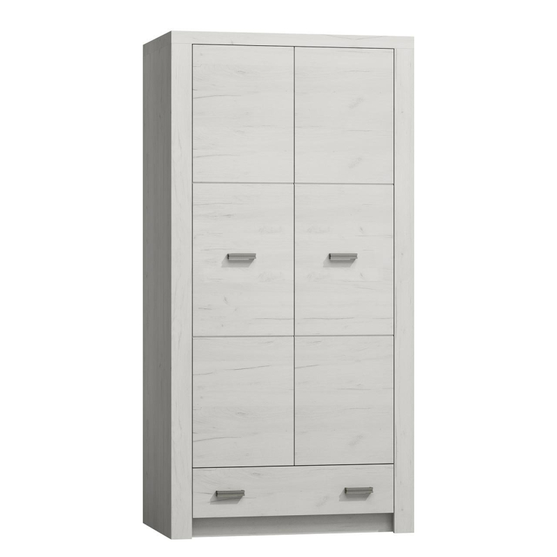 Dvoudveřová šatní skříň Nadia se zásuvkou je ztělesněním stylu a nadčasové elegance. Její jednoduchý tvar a tlumený design podtrhne kvality interiérů zařízených v jakémkoli stylu. Šatní skříň je k dispozici v nadčasové paletě barev a její čela zdobí kovové úchytky ve stylu shodném s ostatním nábytkem. Uvnitř skříně se nachází tyč na zavěšení oděvů na ramínka. V její spodní části se navíc nachází praktická zásuvka.