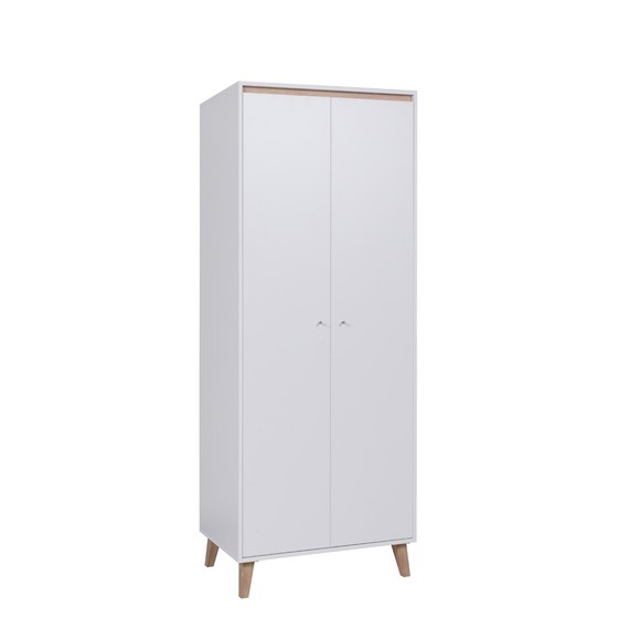 Dvoudveřová šatní skříň Naviedo NV01 SZ2D stylově odkazuje na skandinávské trendy. Ten je ovlivněn jednoduchým tvarem nábytku s měkkými kulatými úchytkami a vysokými sloupovitými nohami. Celek ještě podtrhuje dostupné barevné provedení, které vychází z bílé barvy a barev připomínajících přírodní dřevo.