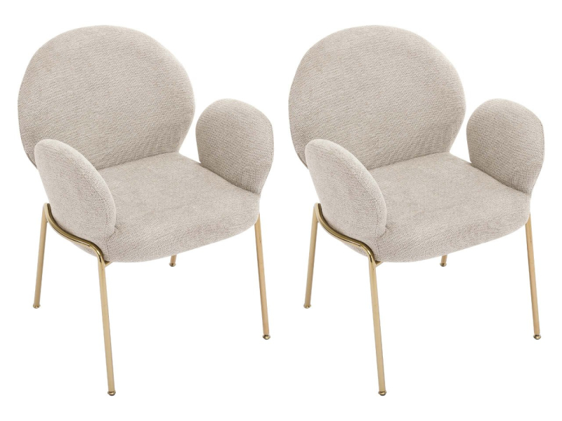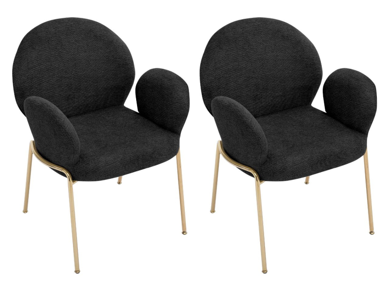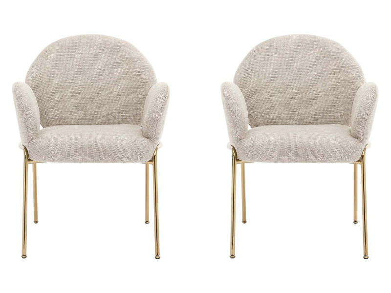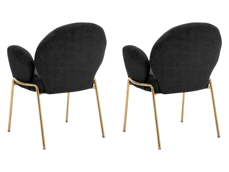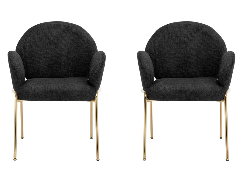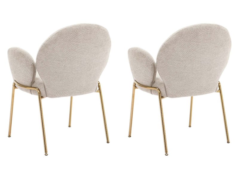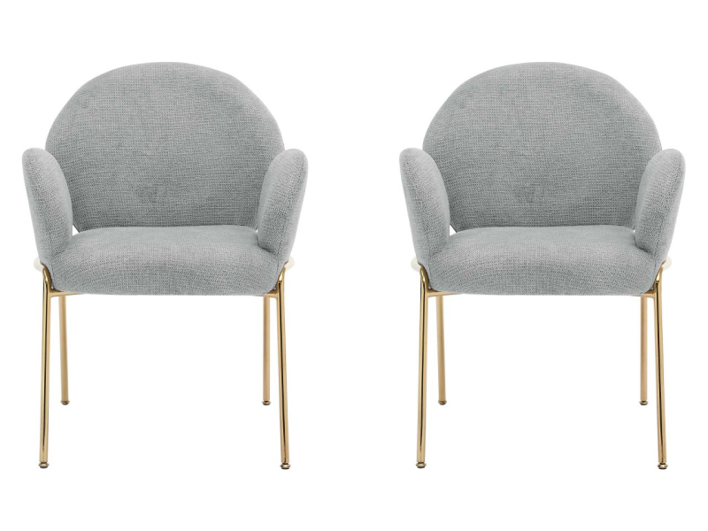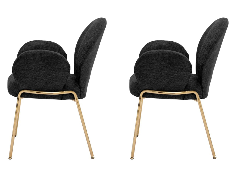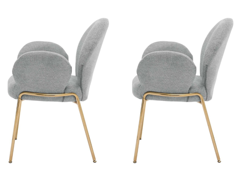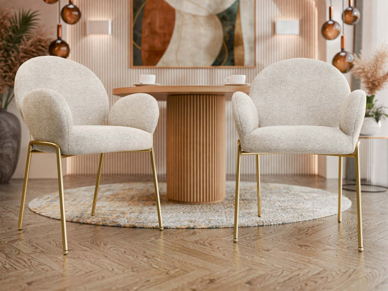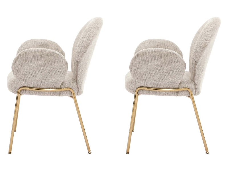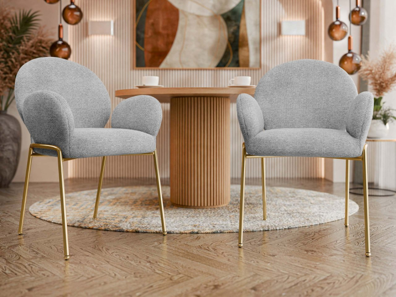 Tvar a proporce čalouněných židlí nepochybně nenápadně umocní charakter interiéru. Jejich moderní styl je patrný ze zaoblených linií a štíhlých kovových nohou zlaté barvy.