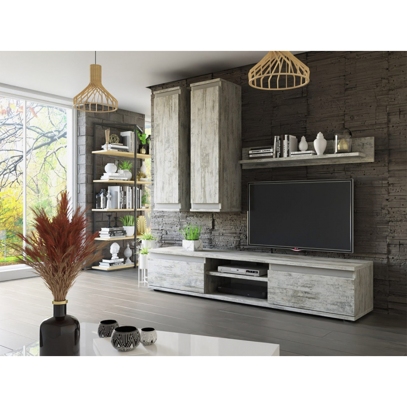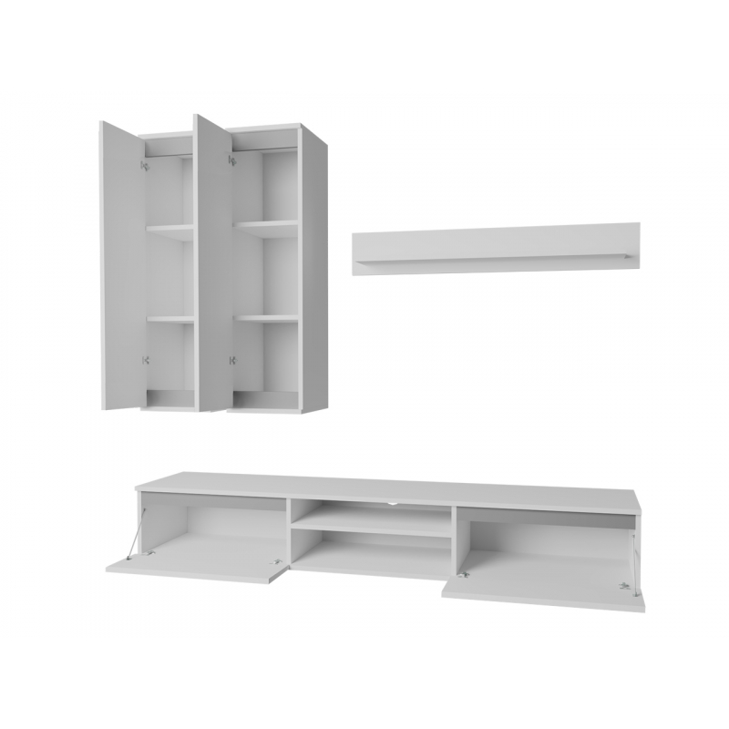 Součástí nástěnné jednotky jsou dvě závěsné skříňky, police a skříňka RTV.