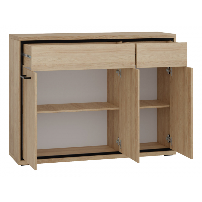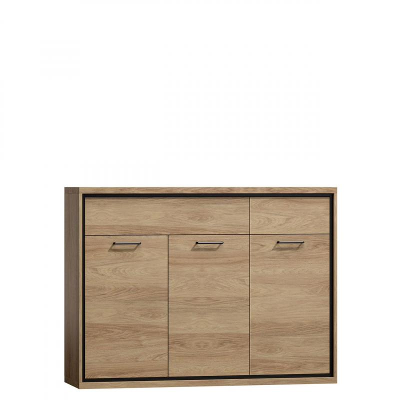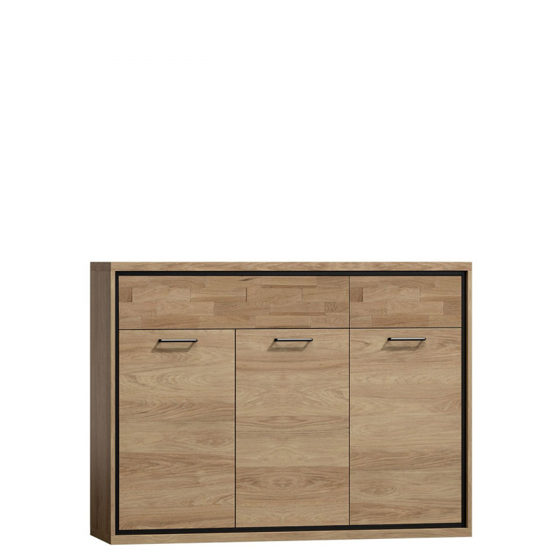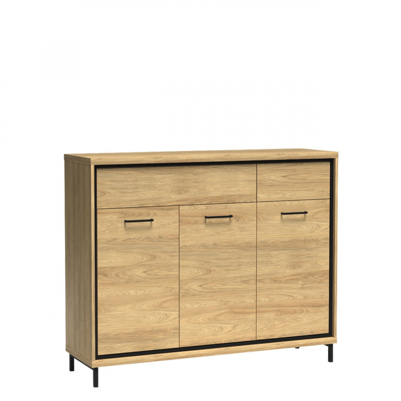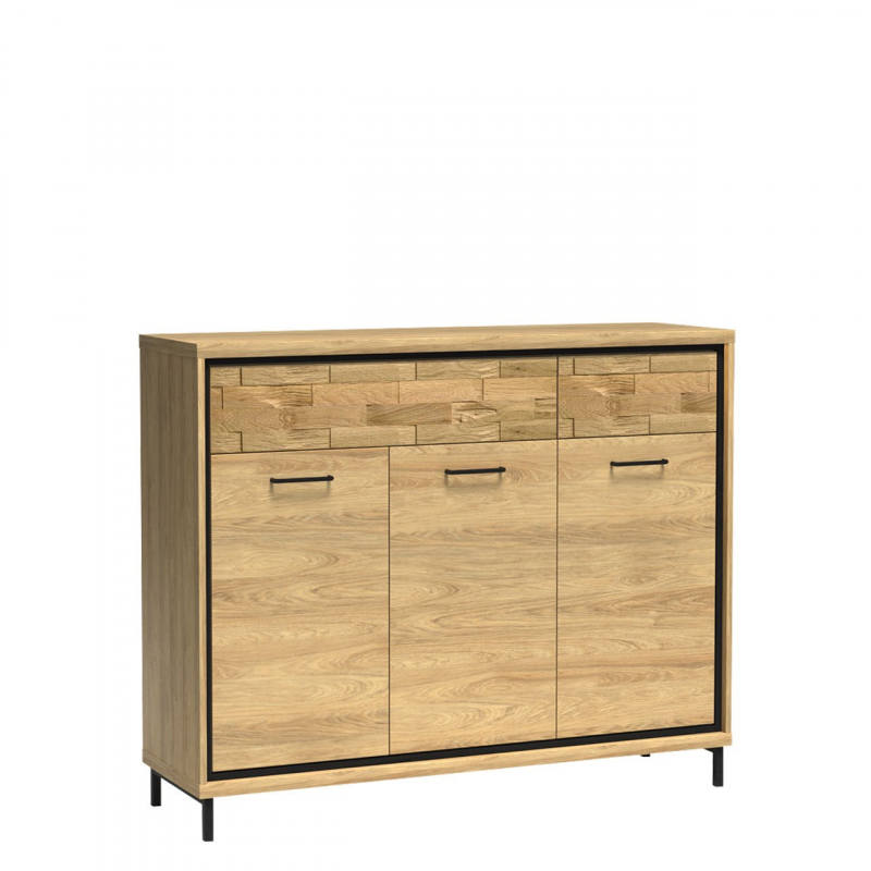 Spodní část komody nabízí skříňky s policemi. Jejich dekorativním prvkem jsou černé kovové úchyty, které dokonale ladí se stylem nábytku.