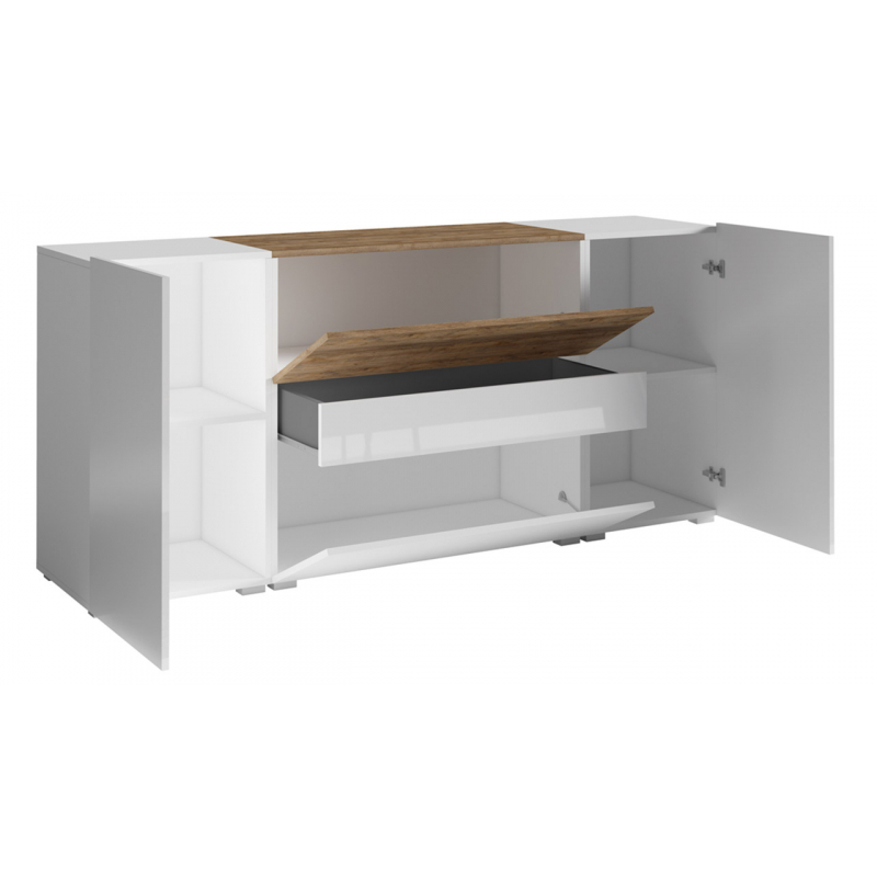 Komoda Power I 26 má skříňku, která se otevírá směrem dolů a nahoru, dvě skříňky s vnitřními policemi a hlubokou zásuvku.