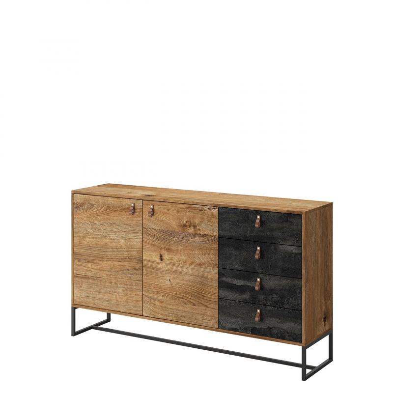 Moderní komoda Sokrates je jedním z nejprodávanějších! Komoda představuje surový, industriální styl. Je to ovlivněno použitými barvami a expresivní texturou napodobující dřevo, tradiční nohy byly nahrazeny kovovým rámem. Kov je velmi žádaný materiál v industriálním stylu. Celek doplňují originální úchyty, které byly vyrobeny z kůže.