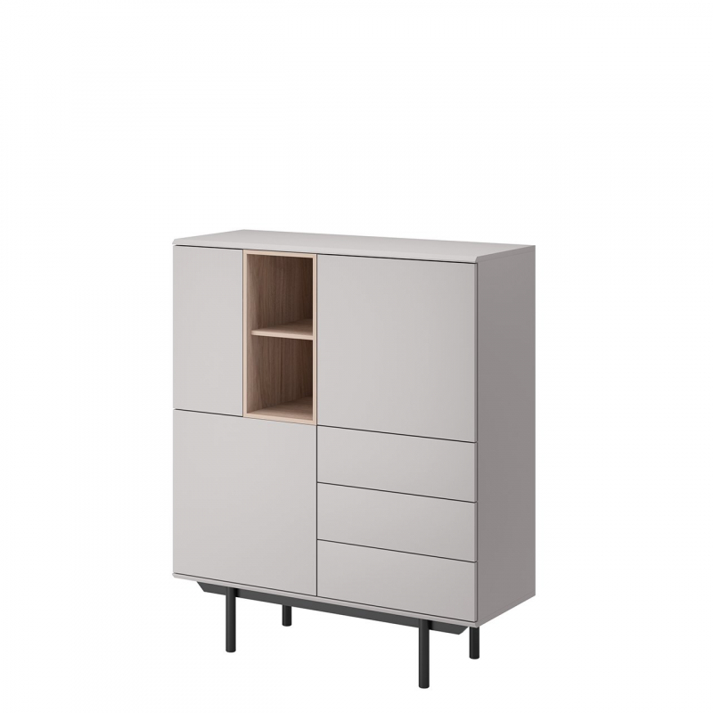 Komoda je vyrobena z pevné laminované dřevotřísky, umístěná na odolných, dřevěných nožičkách v černé barvě.