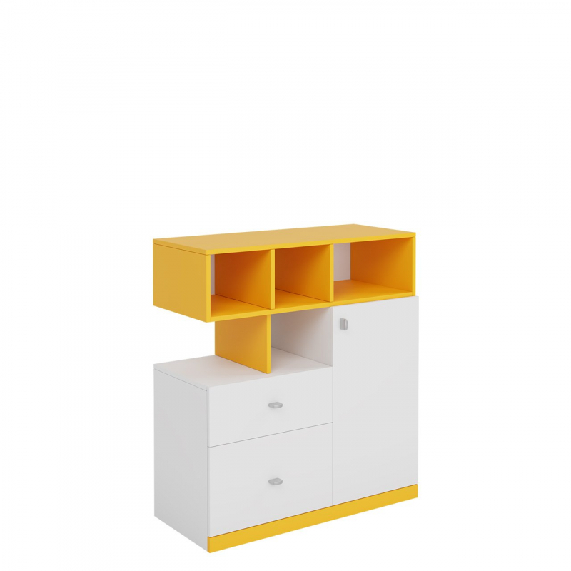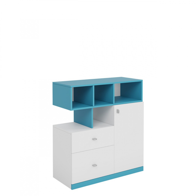 Horní část komody tvoří otevřené, geometrické police, které jsou jako stvořené pro vystavení oblíbených předmětů vašeho dítěte. Navíc jsou zvýrazněny módní a mladistvou barvou. Dalším prvkem komody je prostorná skříňka a dvě zásuvky, které se ovládají jednoduše a tiše díky válečkovým vodítkům.