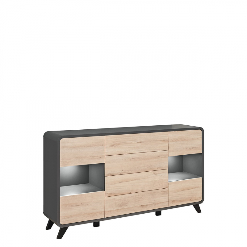 Komoda je navíc vyrobena z kvalitních komponentů. Ve svém prostoru nabízí zásuvky, skříňky a dvě police s LED osvětlením, které budou skvělým úložným prostorem pro vaše oblíbené předměty.