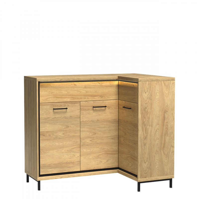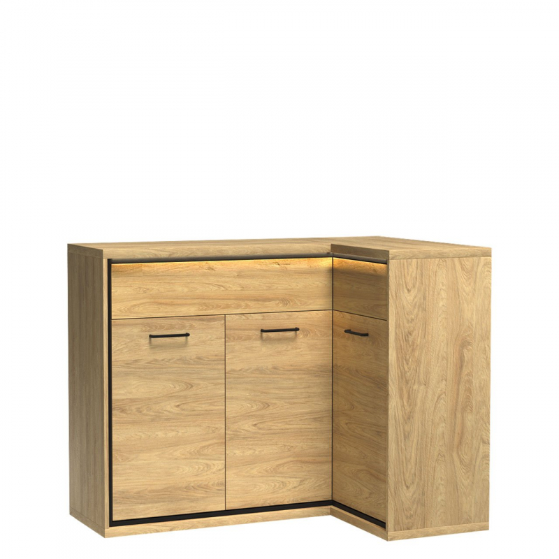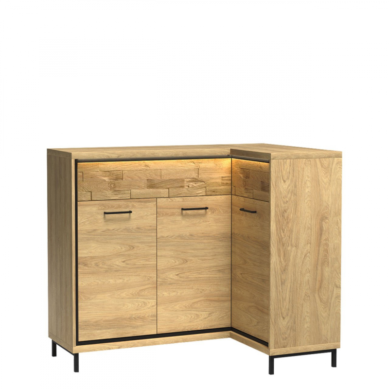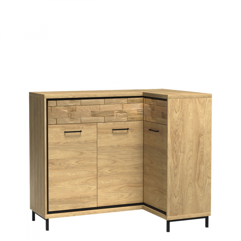 Dobrý styl rohové komody Sarged SR15 K umocní vzhled klasického obývacího pokoje. Dřevěné vzory doplňuje dekor v tmavých barvách, díky čemuž se nábytek skvěle hodí do loftových a industriálních interiérů.