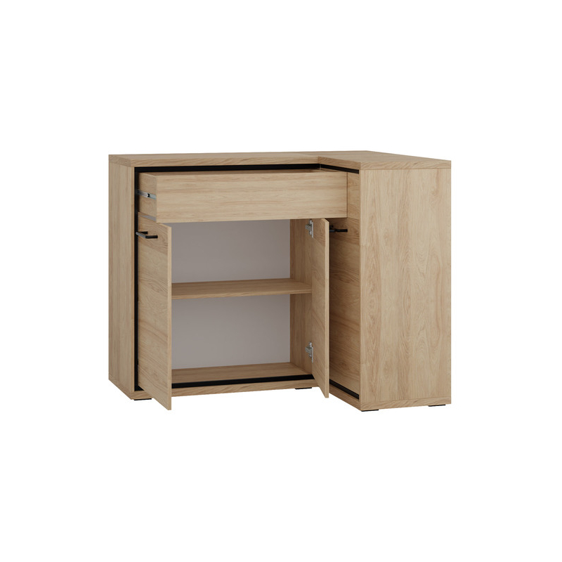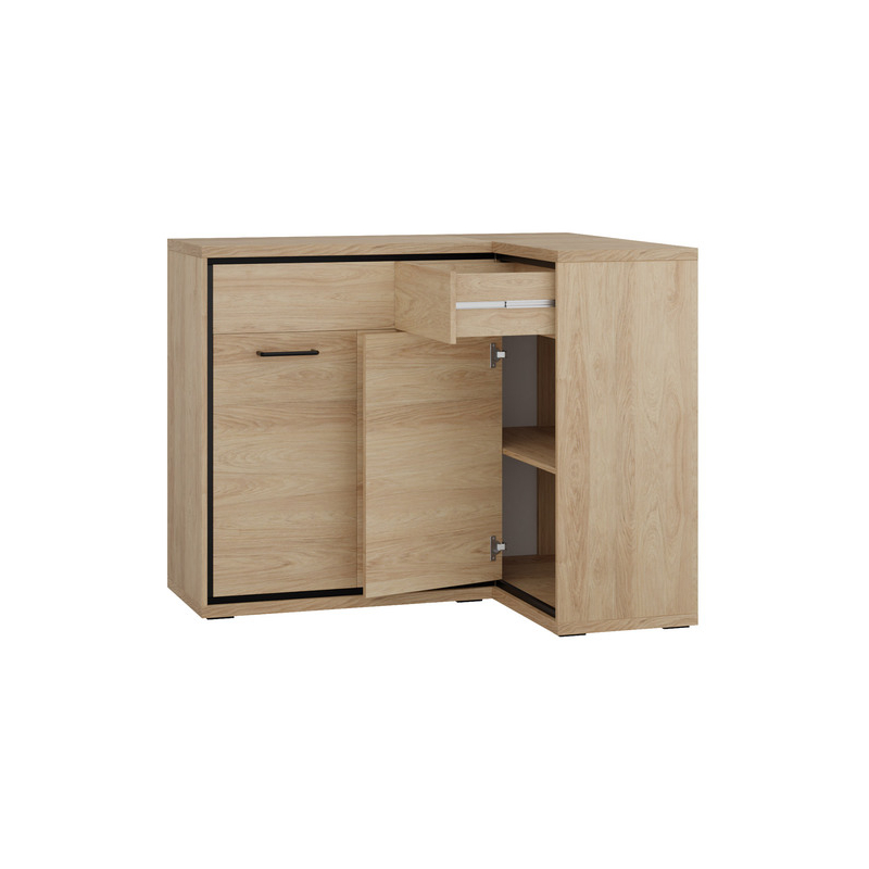 Rohové uspořádání komody zvyšuje kapacitu každé z přihrádek. Jak v zásuvkách, tak v prostorných skříňkách můžete uložit příslušenství různých velikostí. Počínaje od svátečního nádobí, přes sezónní dekorace, až po jiné předměty, které dosud neměly místo.