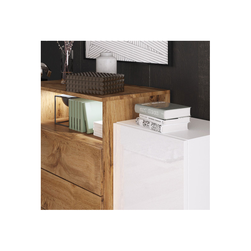 Umístěním moderní komody Layla II můžete podtrhnout jedinečný charakter svého obývacího pokoje. Kombinace nejmódnějších barev oživí prostor a dodá mu nádech extravagance. Zajímavý tvar nábytku zase dodává interiéru originální vzhled.