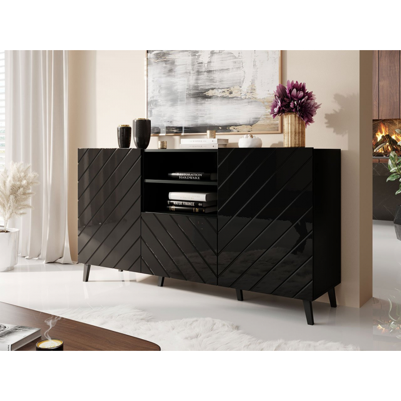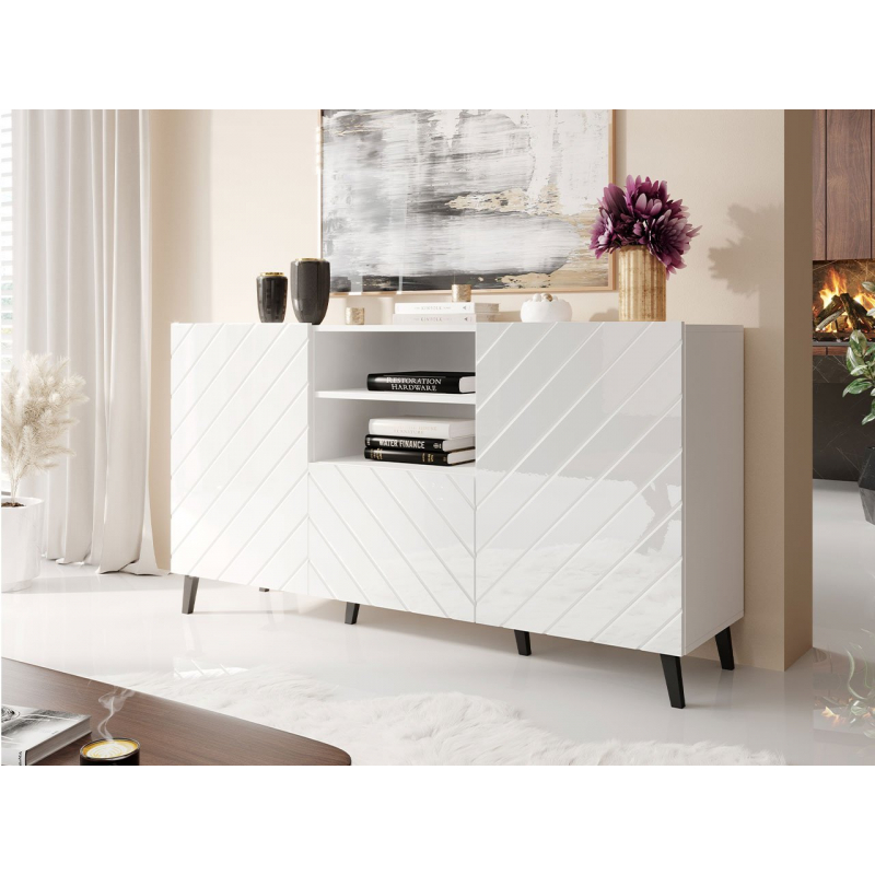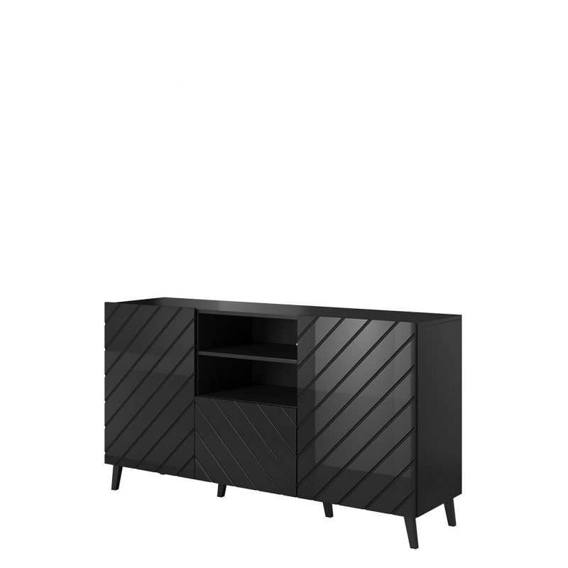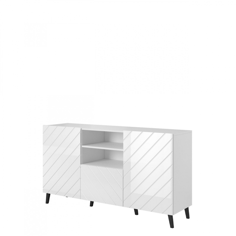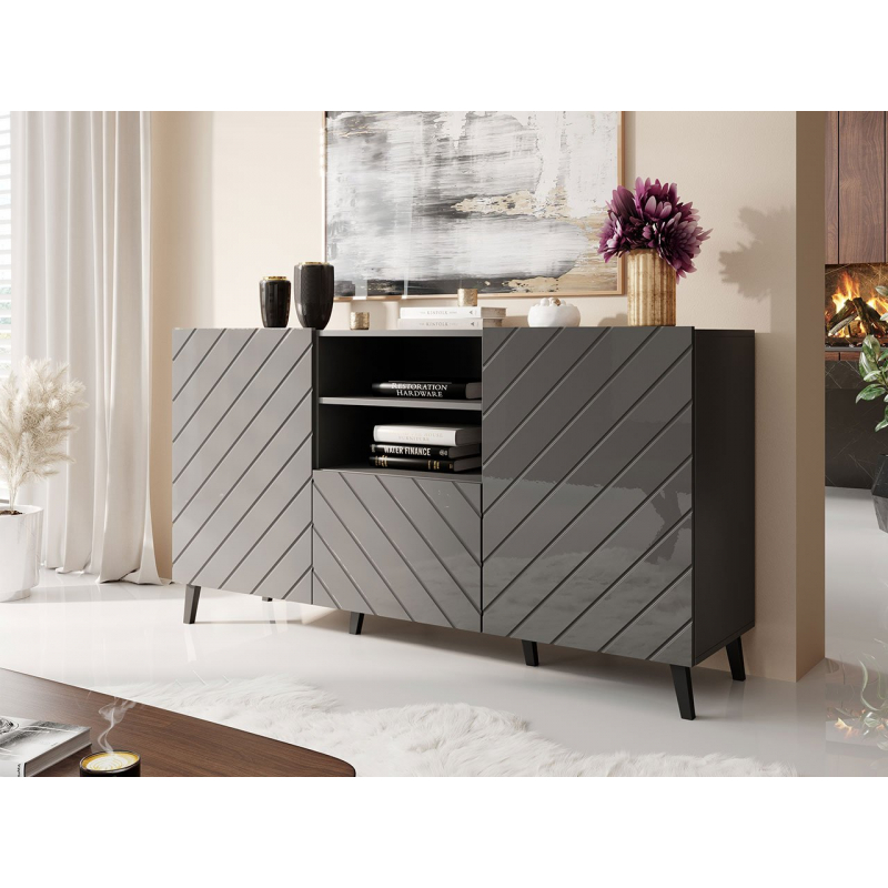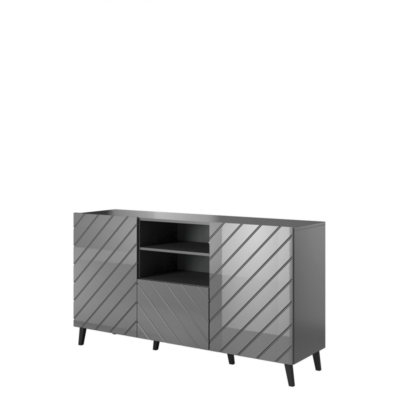 Dekoračním akcentem komody jsou naopak frézy na přední straně nábytku, které vytváří zajímavý vzor. Celé to doplňují vysoké nohy. Komoda je navíc vybavena systémem „tichého zavírání“.