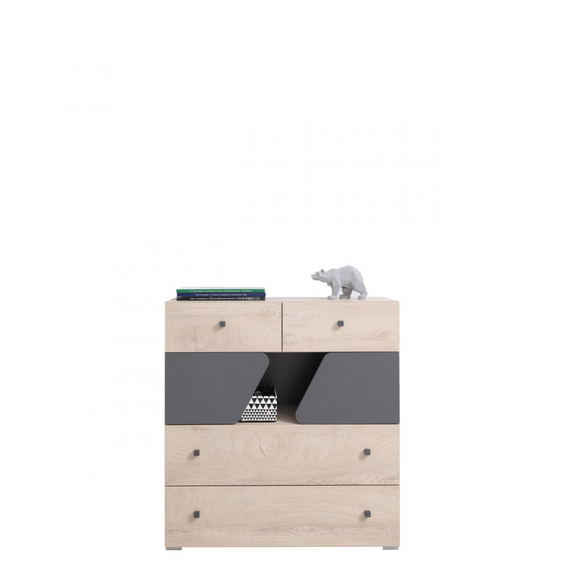 Univerzální barevná kombinace komody Pionier PO10 se dokonale hodí k zařízení chlapeckého i dívčího pokoje. Neutrální barva imitující přírodní dřevo v kombinaci s antracitem je nejoblíbenějším řešením používaným v interiérech.