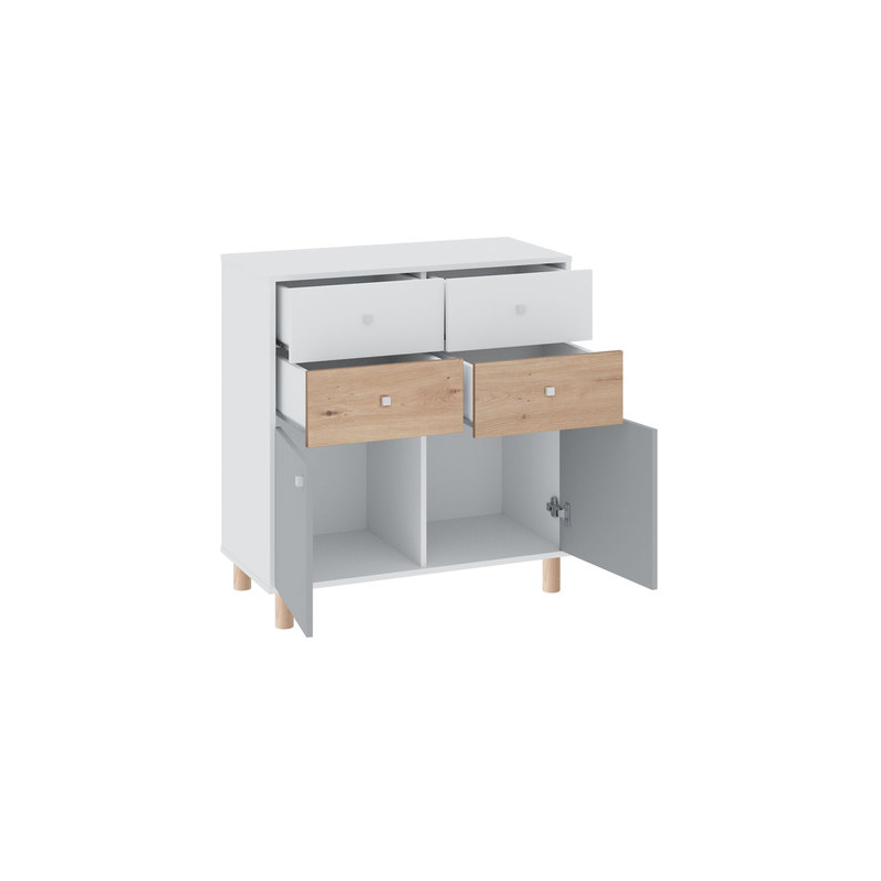 Komoda na nožičkách je perfektním řešením pro náročné zákazníky. Jemné barvy poskytují neomezené možnosti pro různá aranžmá. Její krásný vzhled doplňují drobné detaily v podobě bílých kovových úchytek.