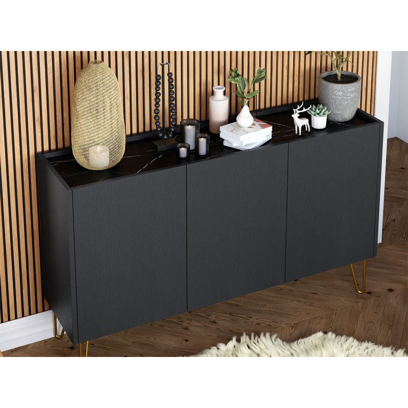 Komoda Animere AK144 zaujme svou originalitou a dodá místnosti osobitý charakter. To vše díky jemně integrovaným kovovým nohám zlaté barvy, které v kombinaci s černým korpusem tvoří mimořádně elegantní kus nábytku. Komoda Animere se bezesporu stane chloubou vkusně zařízeného obývacího pokoje.