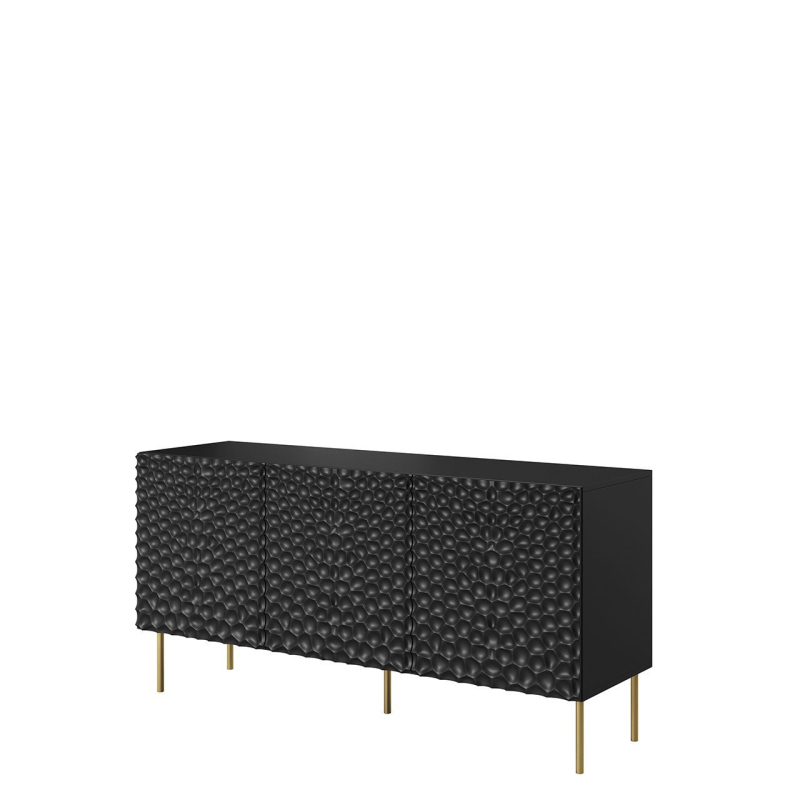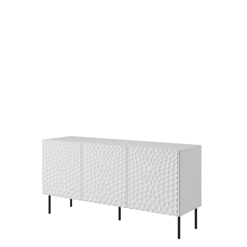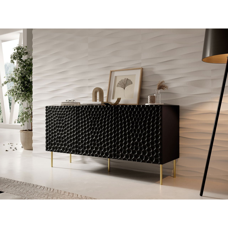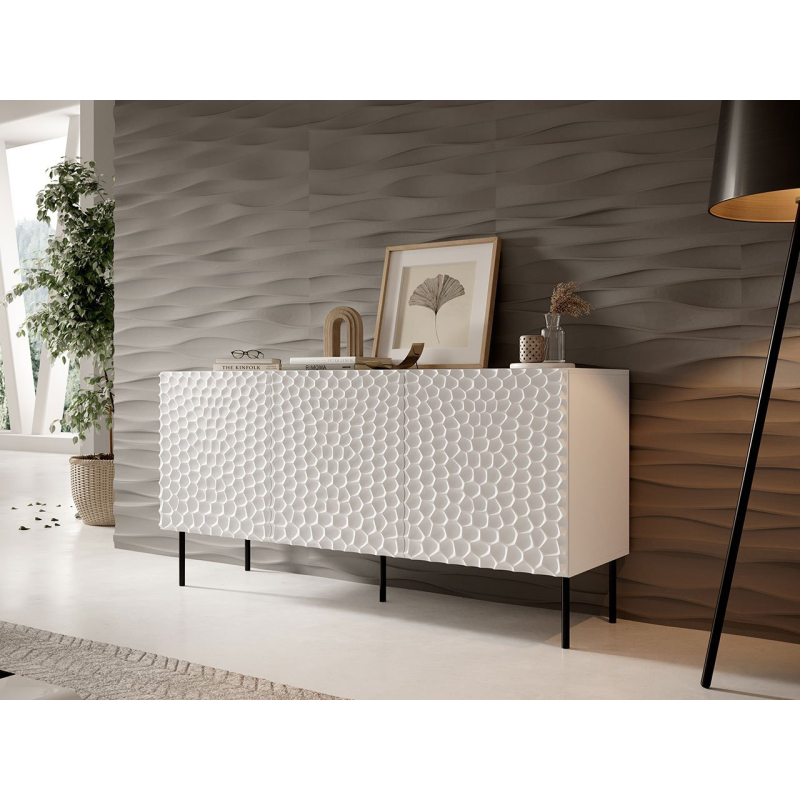 Komoda Erizerto 152 se vyznačuje výrazným designem, který se bude skvěle hodit do moderních obývacích pokojů. Charakteristickým prvkem modelu Erizerto je přední část s 3D texturou, která zdůrazňuje jeho moderní charakter. Komoda byla navíc vybavena systémem otevírání PUSH TO OPEN, který rovněž doplňuje její modernistickou image. Konstrukce prezentovaného modelu je založena na kovových, vysokých nohách.