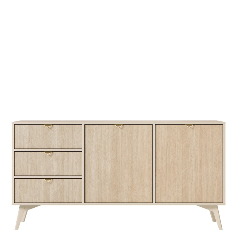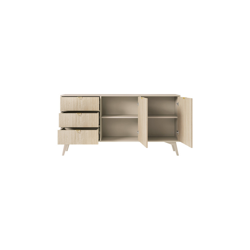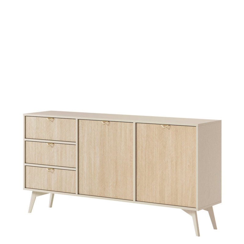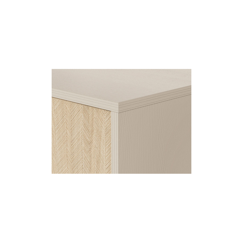 Komoda Mireno KSZ158 vnese do vašeho interiéru přirozenou krásu a praktičnost. Současný design nábytku zvýrazňuje zlatý úchyt, který dodává jemnou záři a poskytuje vynikající kontrast k přední straně dekoru rybí kosti. Tento příjemný akcent přírody dokonale doladí různá interiérová aranžmá.