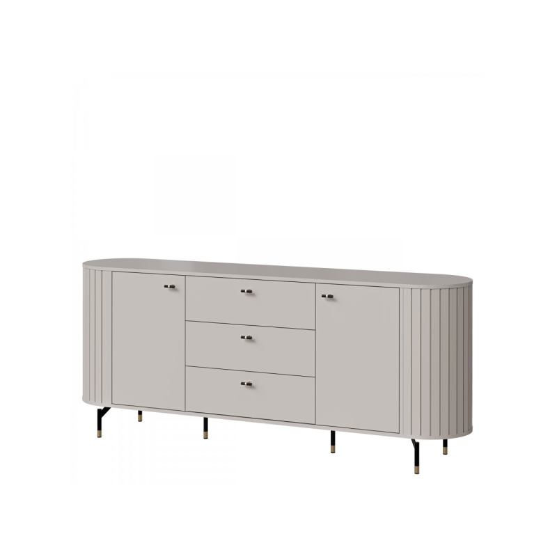 Elegantní komoda se šuplíky a skříňkami Terkiro o rozměru 190 cm umocní stylový vzhled každého interiéru. Minimalistické kouzlo tohoto kusu je narušeno jeho zaoblenými stranami. Poutavé detaily jsou zdobeny prodlouženými frézkami. Toto harmonické duo umocňuje stylový vzhled komody a její elegantní nohy a úchyty ještě více zvýrazňují její design.