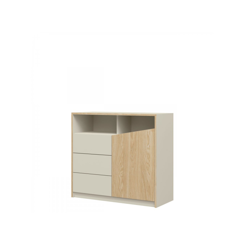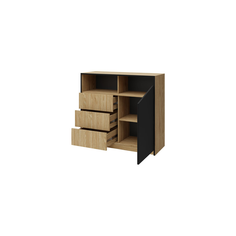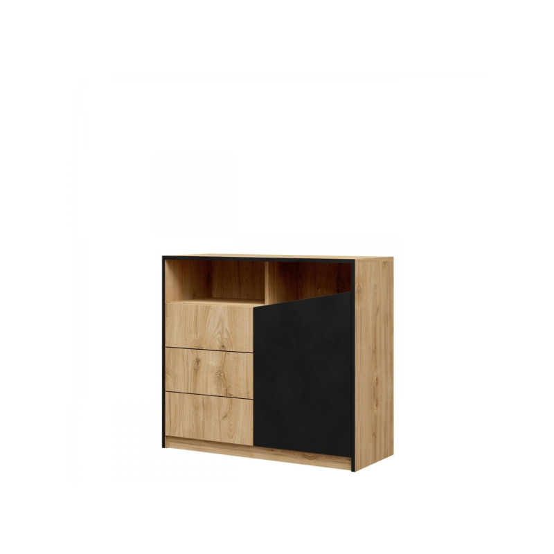 Komoda Frumen FU05 vás potěší krásnou barevnou kombinací. Módní design, který do vašeho interiéru vnese teplo a eleganci. Skvěle se bude hodit do každé místnosti, ať už je to ložnice, obývací pokoj, chodba nebo pokoj pro mládež. Moderní komoda je vybavena prostornými zásuvkami, ideálními pro uložení drobností a doplňků, dále policemi a skříňkou, které umožňují snadné uspořádání rozměrnějších předmětů, např. knih.