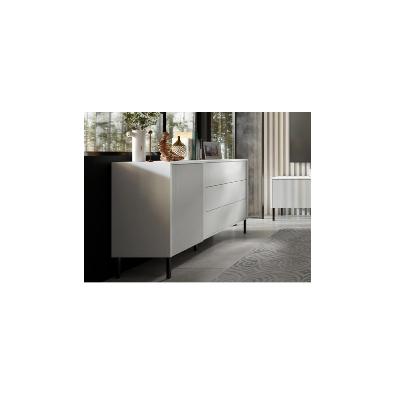 Hlavními výhodami komody Steraen SE03 je všestranný, elegantní vzhled a praktické vlastnosti. Její přední strany kombinují hladký povrch s jemnými drážkami. Díky vyvýšené konstrukci je prostorná a zároveň lehká. Je ideální do moderních i klasických interiérů.