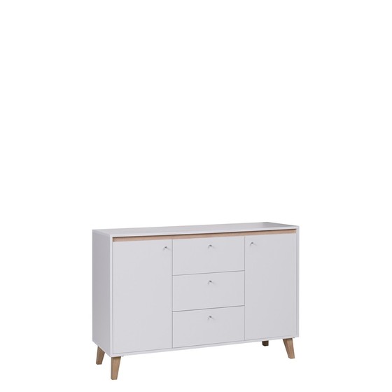 Komoda Naviedo NV04 K2D3SZ na nožičkách je model odkazující na skandinávský styl. Je to způsobeno jednoduchým tvarem nábytku s jemnými kulatými úchyty a vysokými sloupovými nohama. Celé to navíc zdůrazňují dostupné barvy, jejichž základem je bílá a barvy odkazující na přírodní dřevo. Výhodou komody je i její vnitřek, který nabízí hned tři zásuvky a dvě uzavřené skříňky.