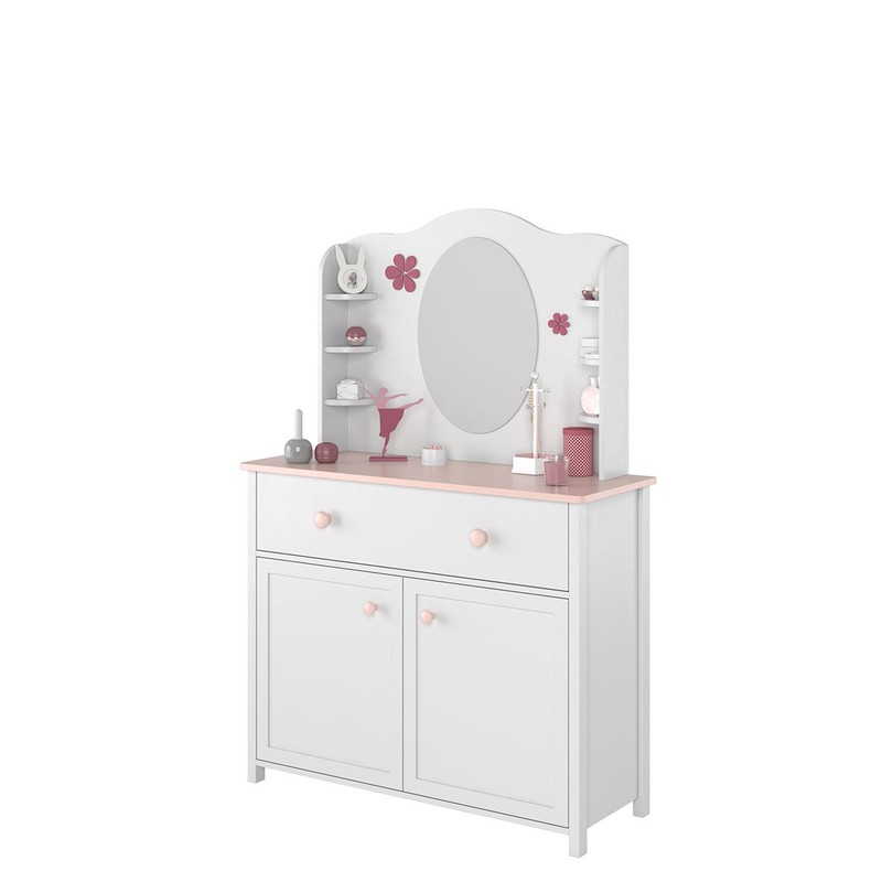 Komoda je vybavena velkou a prostornou zásuvkou a skříní se dvěma policemi. Kromě toho můžete ke komodě přiobjednat nástavec. Vytvoříte tak krásný a dívčí toaletní stolek.