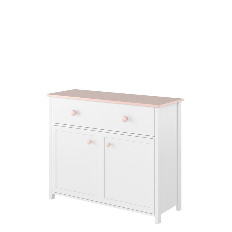 Komoda Luna LN05 je okouzlujícím prvkem do dětského pokoje. Její kouzlo je bezpochyby spojeno s nadčasovou bílou a jemnou růžovou barvou.