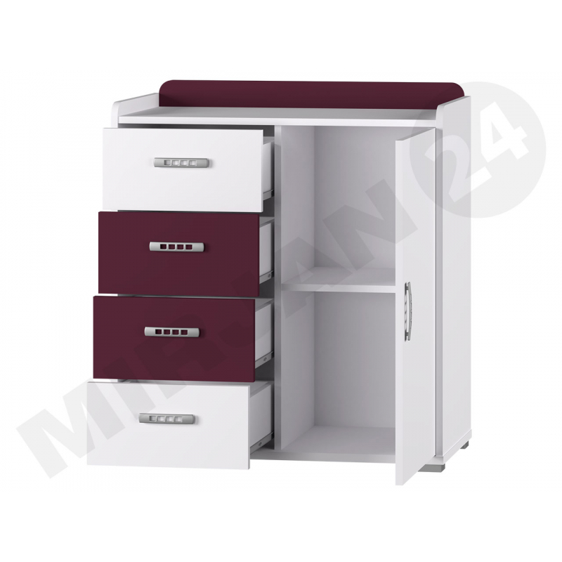 Komoda je vyrobena z laminované desky ve dvou kontrastních barvách. Tento nábytek má prvky v energických barvách.