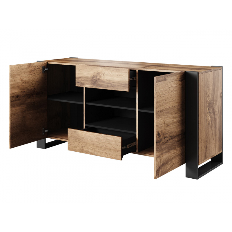 V rámci obdélníkové komody bylo oddělených několik praktických úložných zón. Základnou jsou prostorné skříňky s dveřmi, které umožňují skrýt nahromaděné předměty před očima hostů, kteří vás navštíví. Otevřené police umístěné ve střední části komody poskytují další prostor pro ozdobné dekorace.