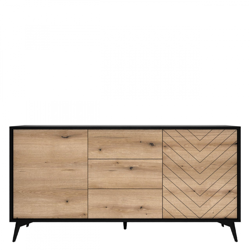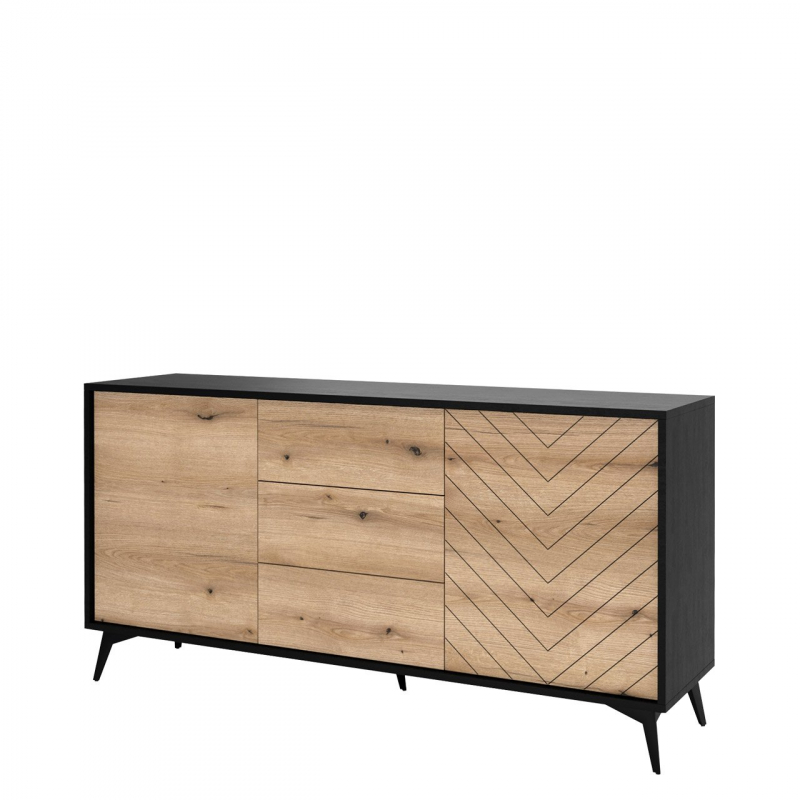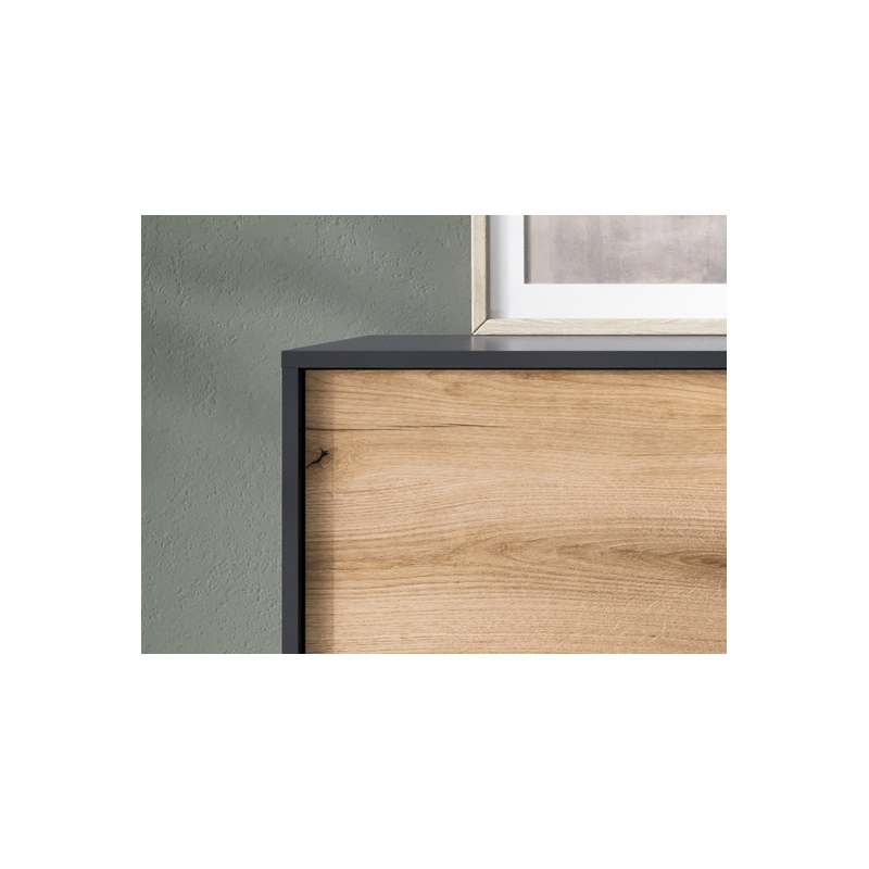Hledáte výrazný nábytek do vašeho interiéru? Věnujte pozornost komodě Namiro. Jeho jednoduchý, klasický design byl rozbit zajímavou dekorací na předních a vysokých kovových nohách. Geometrický vzor dává celé věci neobvyklý charakter. Komoda Namiro pro obývací pokoj je ideálním návrhem pro interiéry zařízené v moderním a podkrovním stylu. Tento model se vyznačuje nejen vizuálními, ale také funkčními aspekty. Komoda se šuplíky má bohatý interiér, který udrží váš byt uklizený. Čela se snadno otevírají díky systému „push to open“. Posuvná vodítka s kuličkovými ložisky, na kterých jsou zásuvky založeny, poskytují úplné prodloužení, díky čemuž se snadno a příjemně používají.