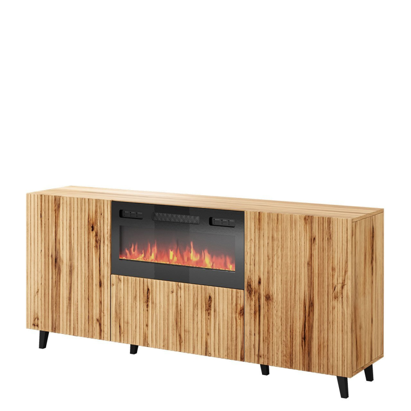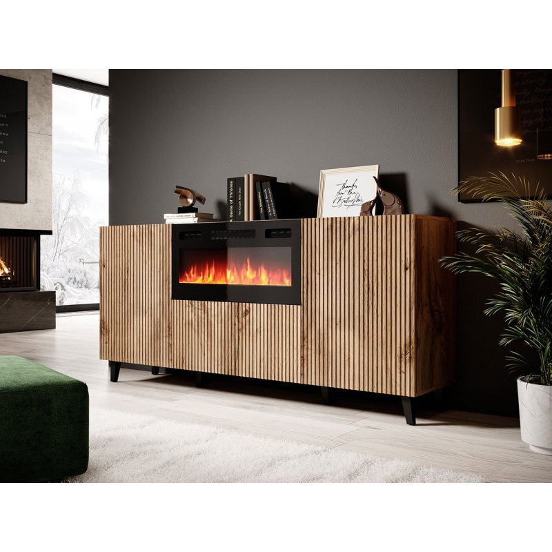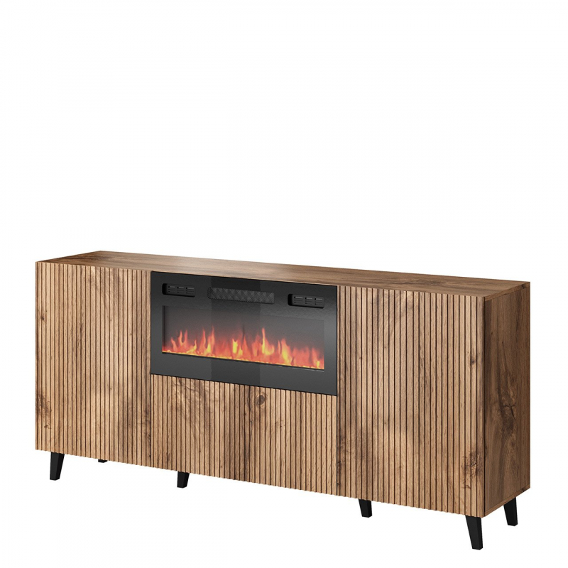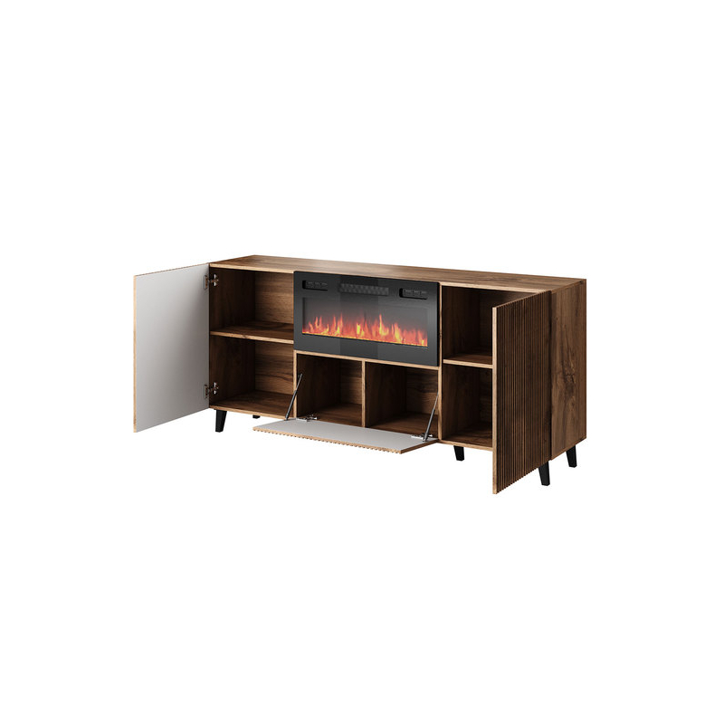 Další výhodou komody je elektrický krb. Má dekorativní funkci, protože LED světlo napodobuje realistický obraz a funkci vytápění. Krb má funkci vytápění v rozmezí 16-28 °C. Součástí balení je také dálkové ovládání. Komoda s elektrickým krbem je postavena na vysokých nohách, což jí dodává módní styl.