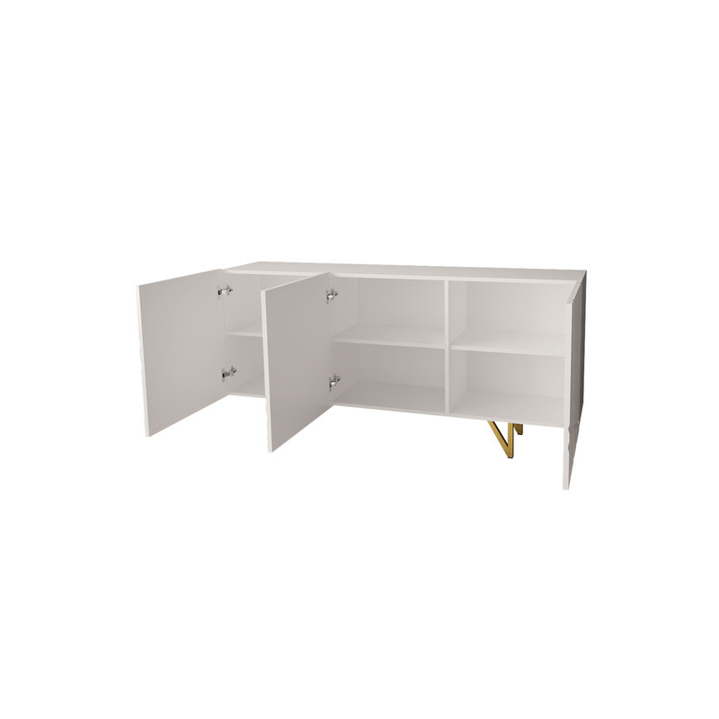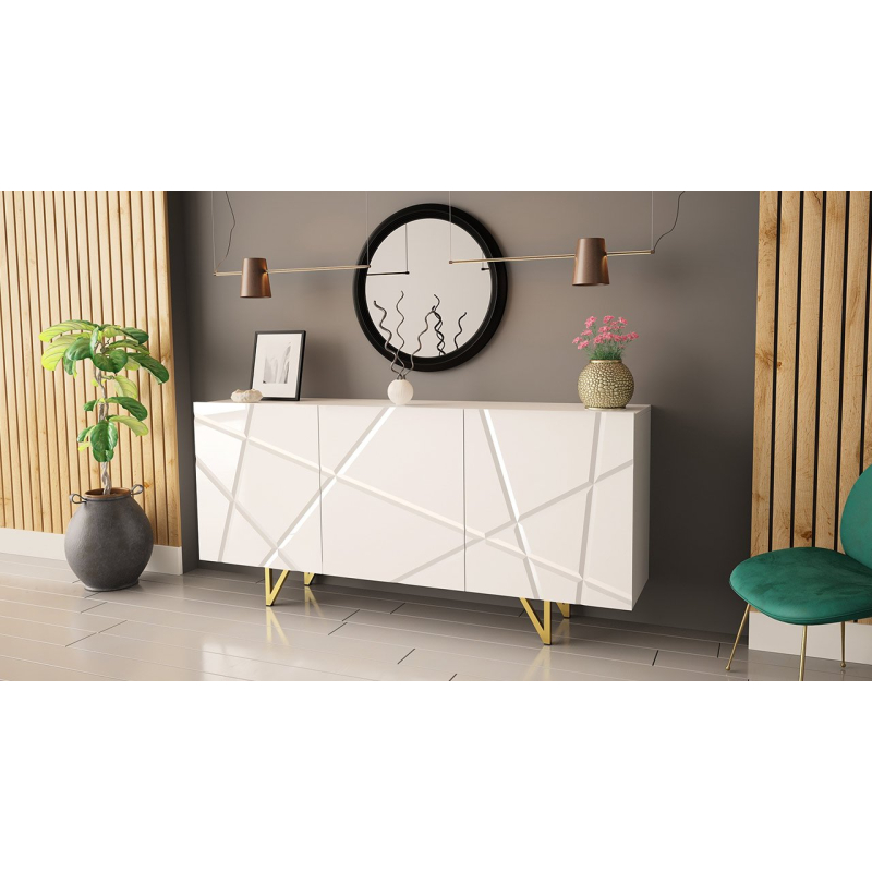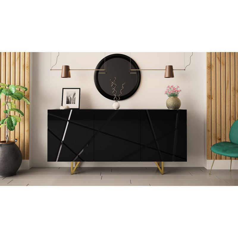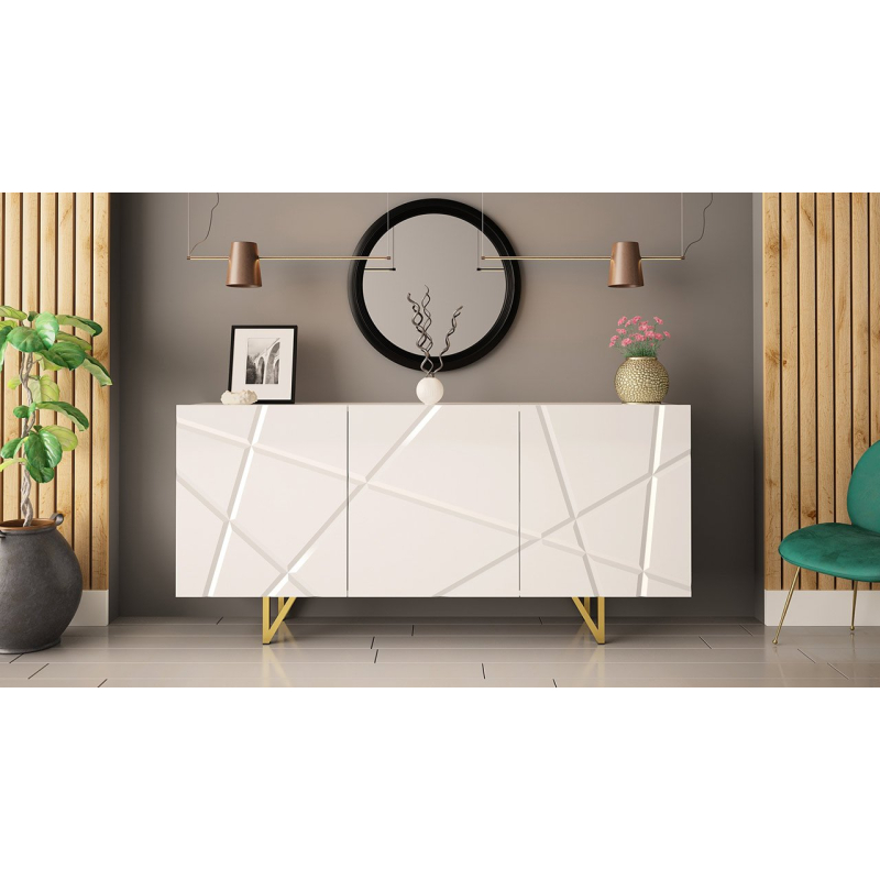 Model sa vyznačuje lesklými čelami, ktoré boli obohacené hlbokým frézovaním. Tento efektný vzor dodáva celému kusu nábytku výrazný charakter. Okrem toho je celá komoda dokrášlená zlatými nohami. Komoda má aj priestranný interiér. Praktické police pojmú mnoho predmetov každodennej potreby. Tento variant komody nemá rukoväte a otváranie je možné vďaka predným častiam mierne vyčnievajúcim nad dosku.