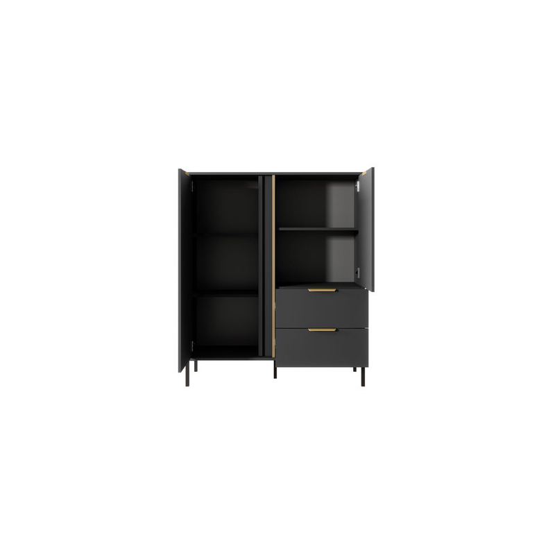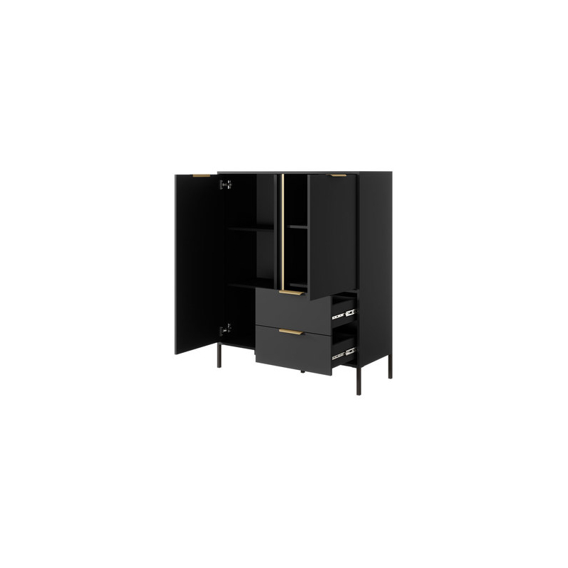 Dvě objemné zásuvky nabízejí prostor pro uspořádání menších předmětů nebo dokumentů. Na druhé straně rozměrné skříňky s policemi pojmou další předměty a zároveň uklidí prostor obývacího pokoje nebo ložnice.