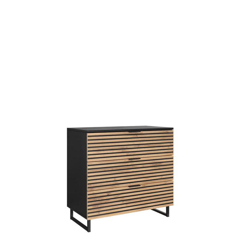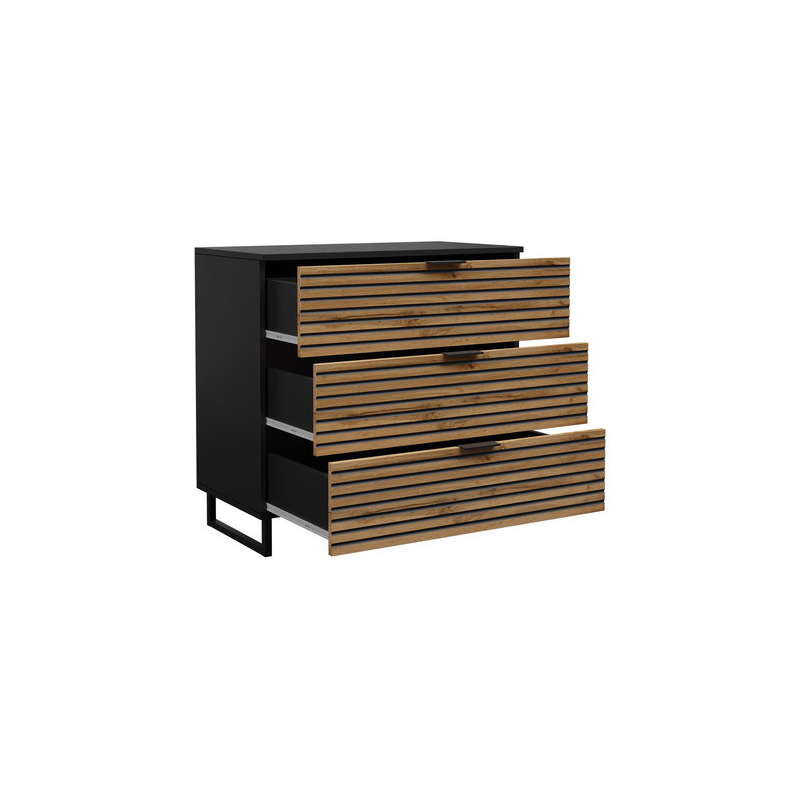 Komoda Surezi 3S vnese do vašeho interiéru jedinečnou atmosféru a funkčnost. Dokonalá kombinace industriálního stylu s elegancí a originalitou. Ornament, kterým jsou frézovaná čela zásuvek, dodává komodě jedinečný charakter. Komoda jistě upoutá pozornost každého, kdo k vám zavítá. Podívejte se na ty geometrické nožky! Dodávají nábytku lehkost a charakter.