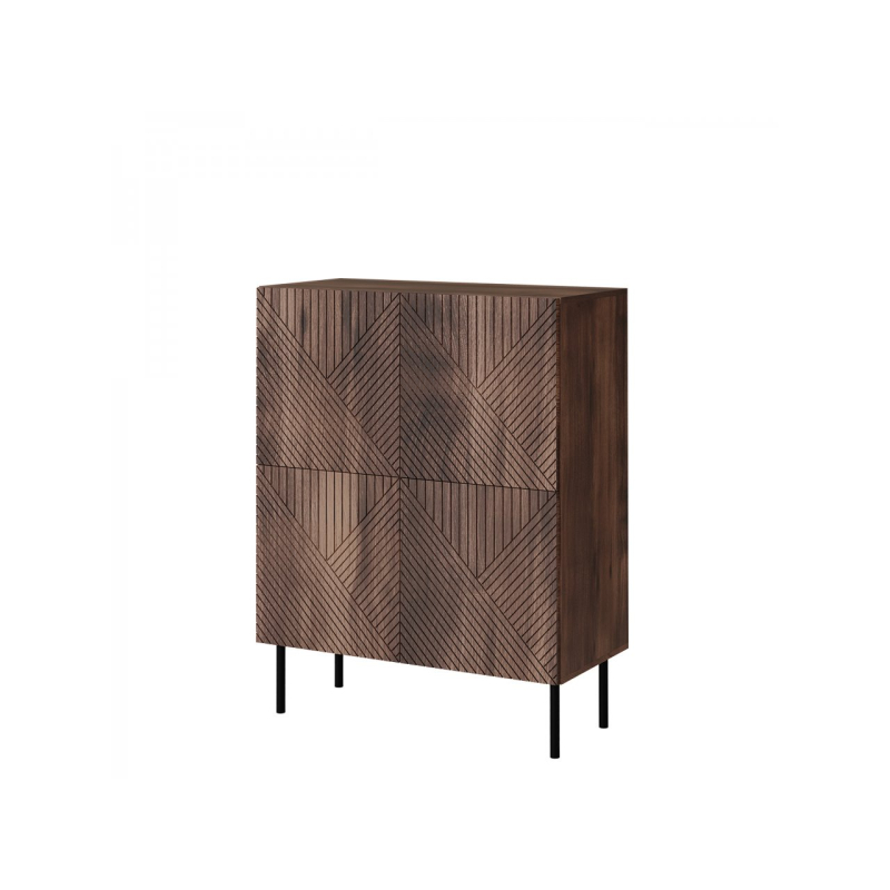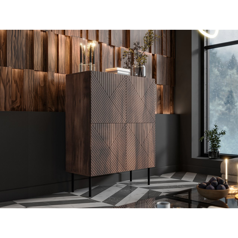 Ceněnou vlastností nábytku je jeho designový vzhled. Módní barevné provedení v kombinaci s originálním designem čel se skvěle hodí do moderních i art deco inspirovaných uspořádání. Celek je doplněn vysokými nožkami. V praxi dodávají komodě lehkost a podporují také snadný úklid podlahy.