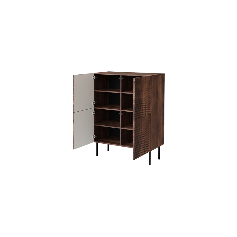 Stylová komoda Azynit 89 4D s nožičkami je mistrem v ukládání. Díky prostorným skříňkám poskytuje dostatek místa pro nejrůznější předměty. Uvnitř komody můžeme uspořádat oblečení, doplňky, dokumenty i jednotlivé kusy nádobí. Pečlivě promyšlená výška jednotlivých polic slouží k maximálnímu využití dostupného prostoru.