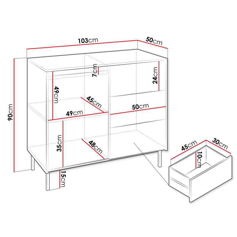 Model nabízí také dostatek prostoru pro organizaci. Tři prostorné zásuvky a dvě prostorné přihrádky pojmou mnoho předmětů. Široký top vám umožní vystavit oblíbené dekorace, květiny a suvenýry z dovolené.