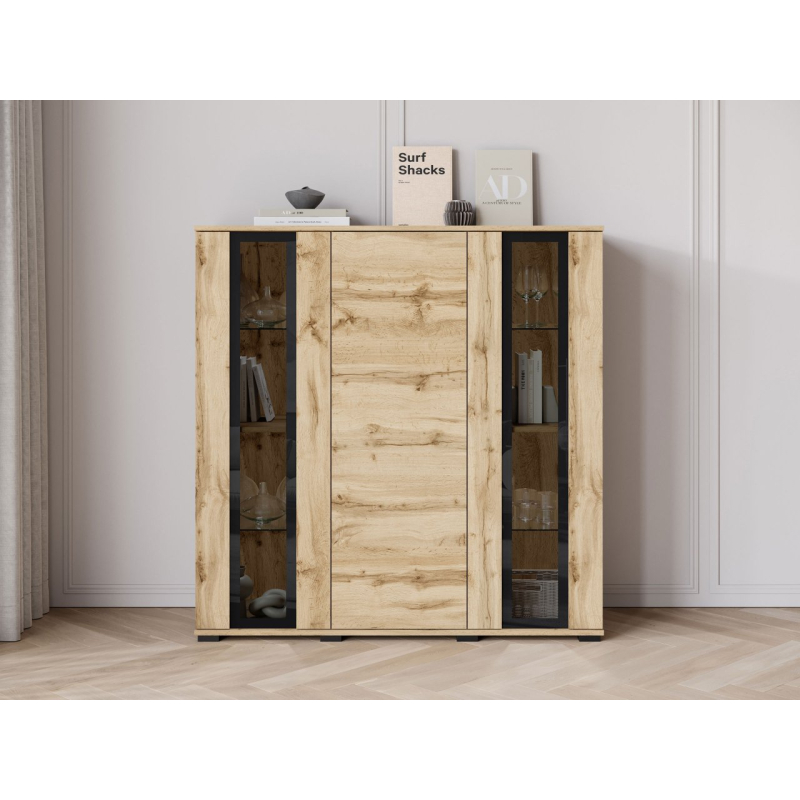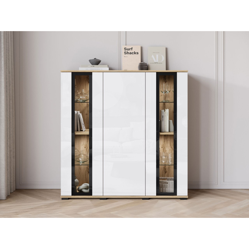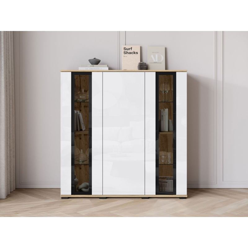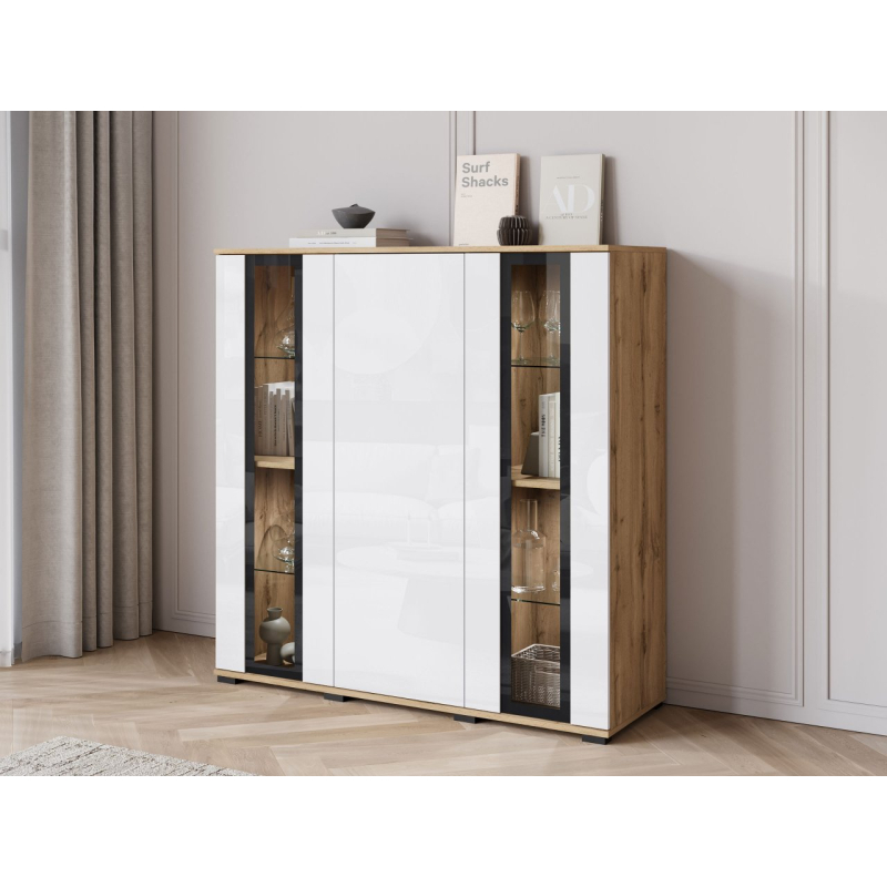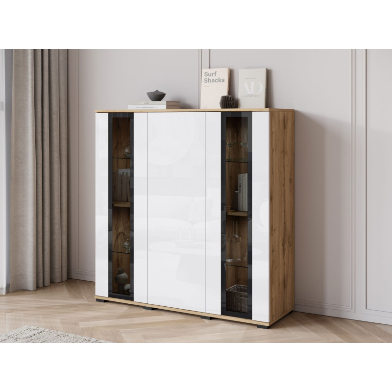 Za masivními čelami se nachází velký úložný prostor v podobě tří polic. Ideální pro udržení pořádku v obývacím pokoji, jídelně nebo kanceláři. Komoda s vitrínou je k dispozici v několika pečlivě vybraných barvách, takže ji snadno sladíte se stylem vašeho interiéru.